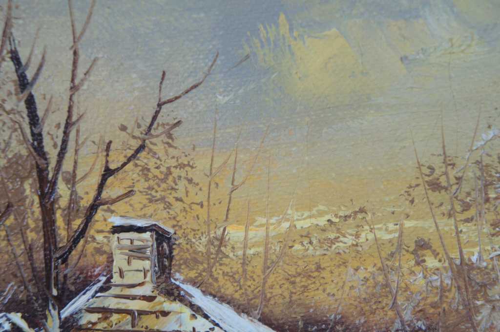 Oil on canvas by W. Newman. Features a snowy landscape of a cabin, cottage or barn. Wood framed in black with acanthus leave details.