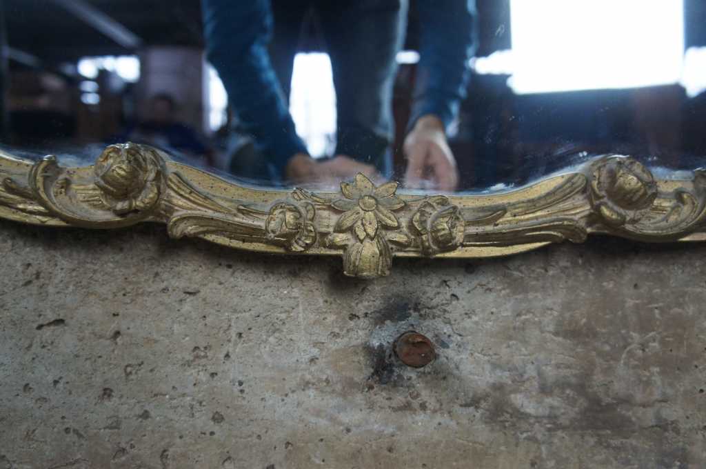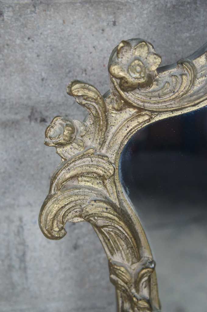 Mid 20th century scalloped wall hanging mirror by Davis Cabinet company. Finished in a distressed antique gold.