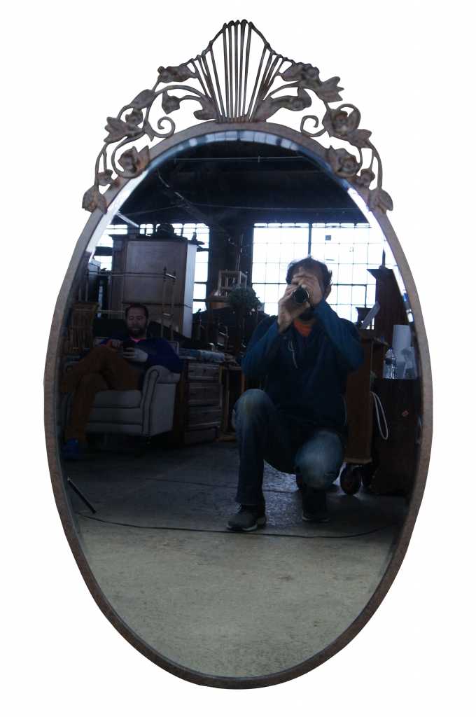 Large French inspired iron mirror. Features an oval shape, beveled glass and floral embellishment crown. Very heavy. Great for use in bathroom, entryway or above vanity.
