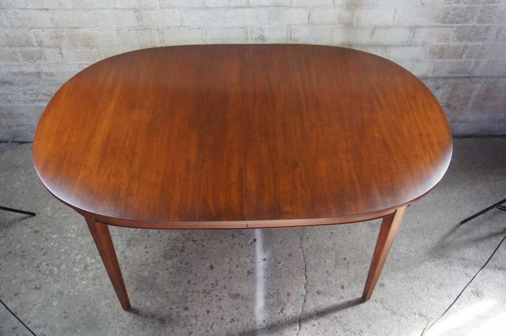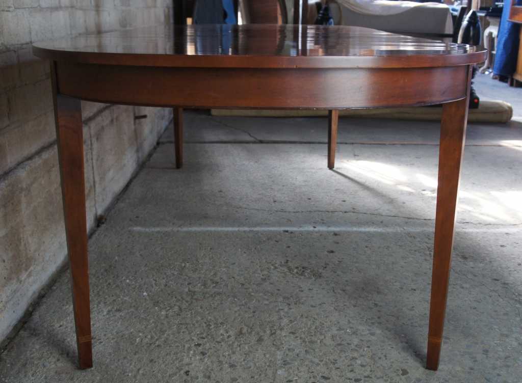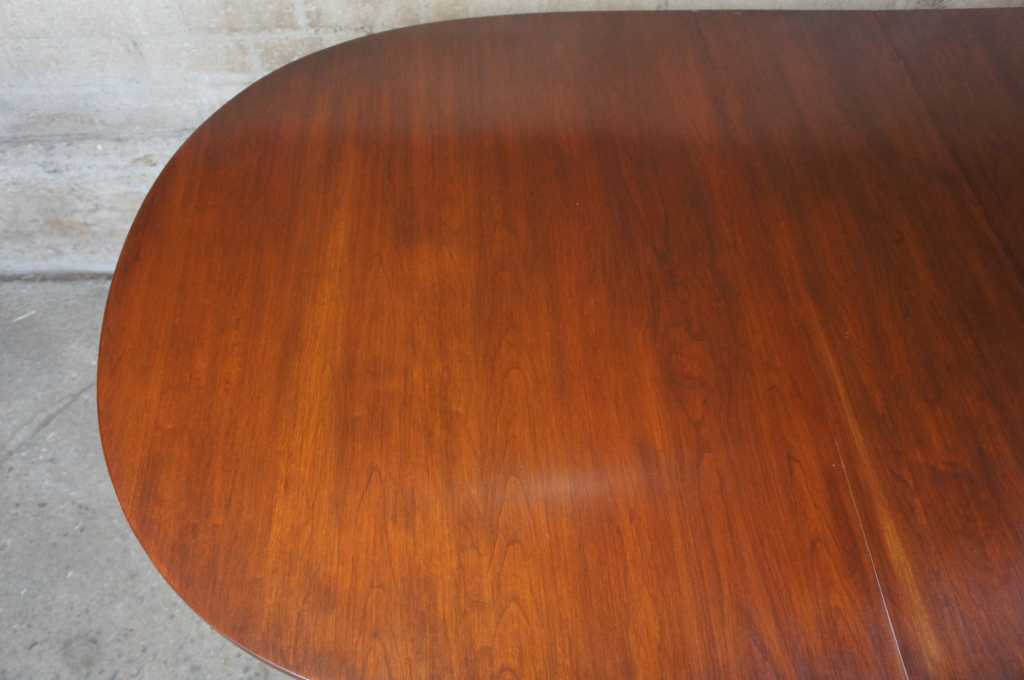 Federal style dining table by Henkel Harris. Made from wild black cherry with the winchester finish. Features oval top, extendable to three leaves with tapered engraved and inlaid mahogany along the legs. Style # 2224, Finish # 24, Shop # 281-526