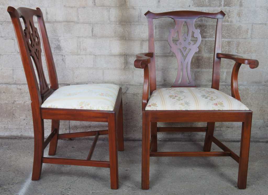 Late 20th century chippendale style dining chairs by Hinkel Harris. Model 101 finish 24. 18th century design. Made from mahogany with traditional splay backs and upholstered seats.