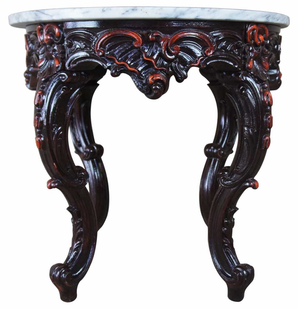 Late 20th century Italian Baroque carved side table. Features a dark tone finish with light red tone accents, white marble top, ornate scalloped and high relief design. A great reproduction for any victorian home.