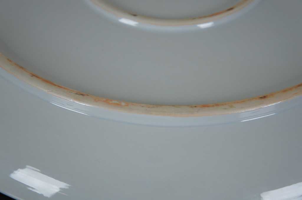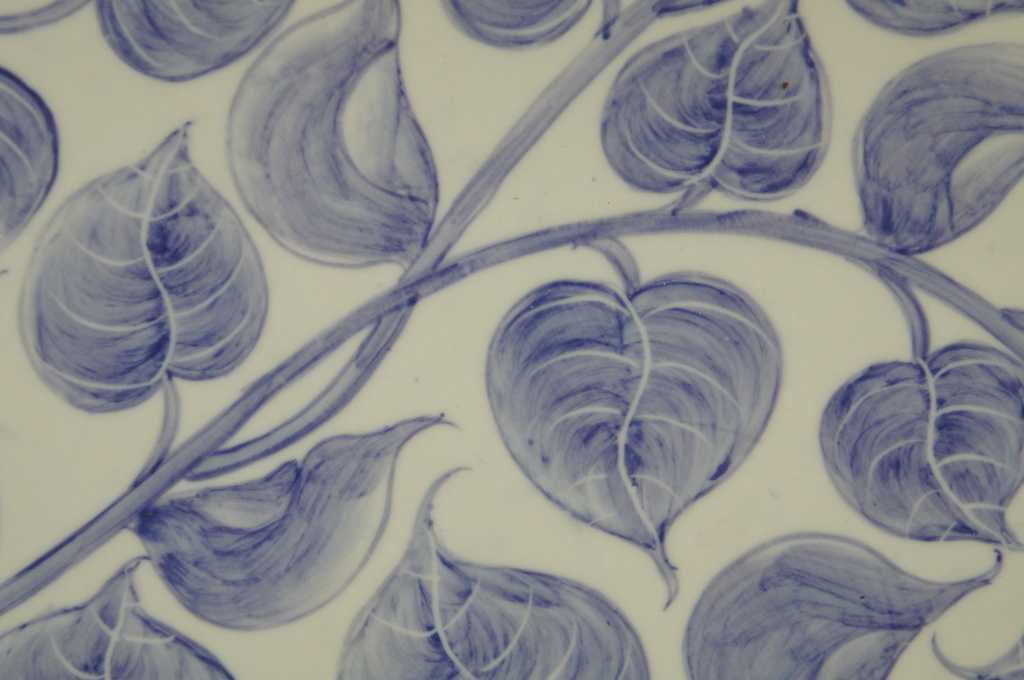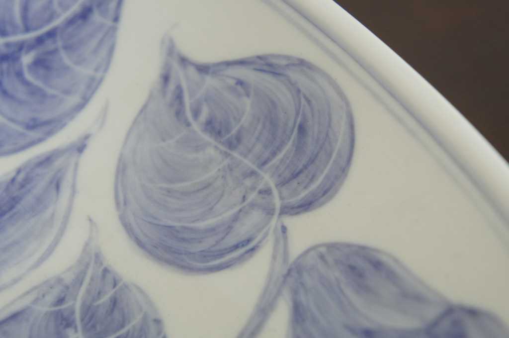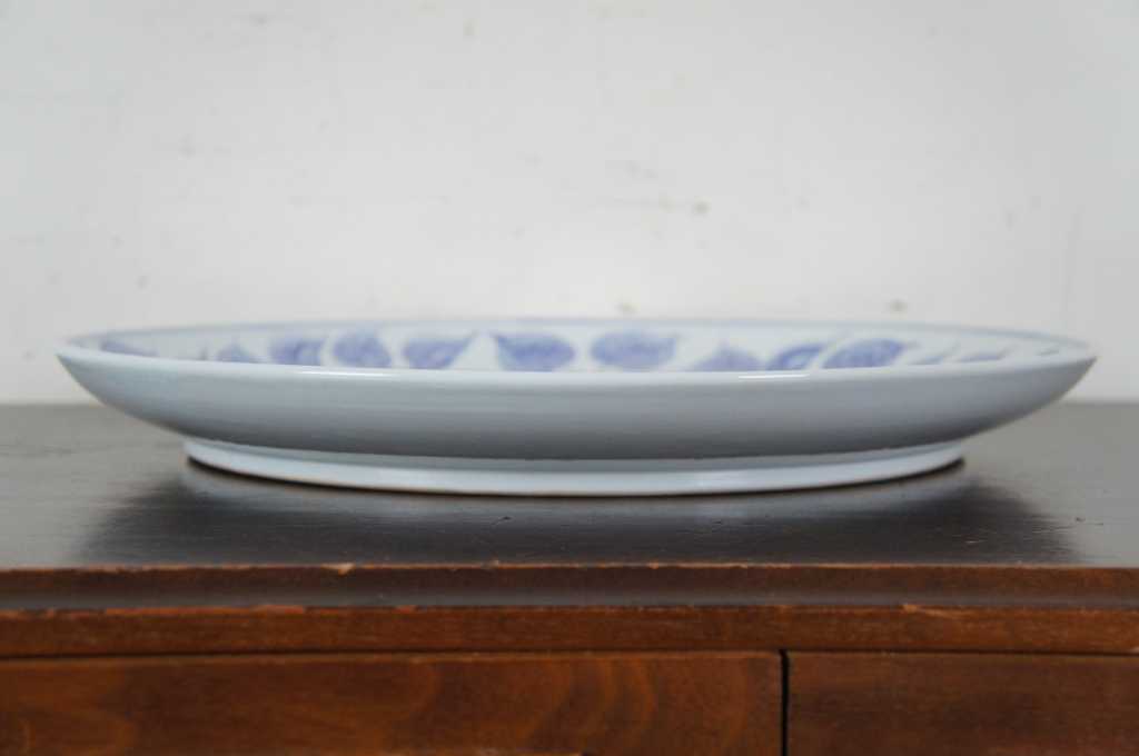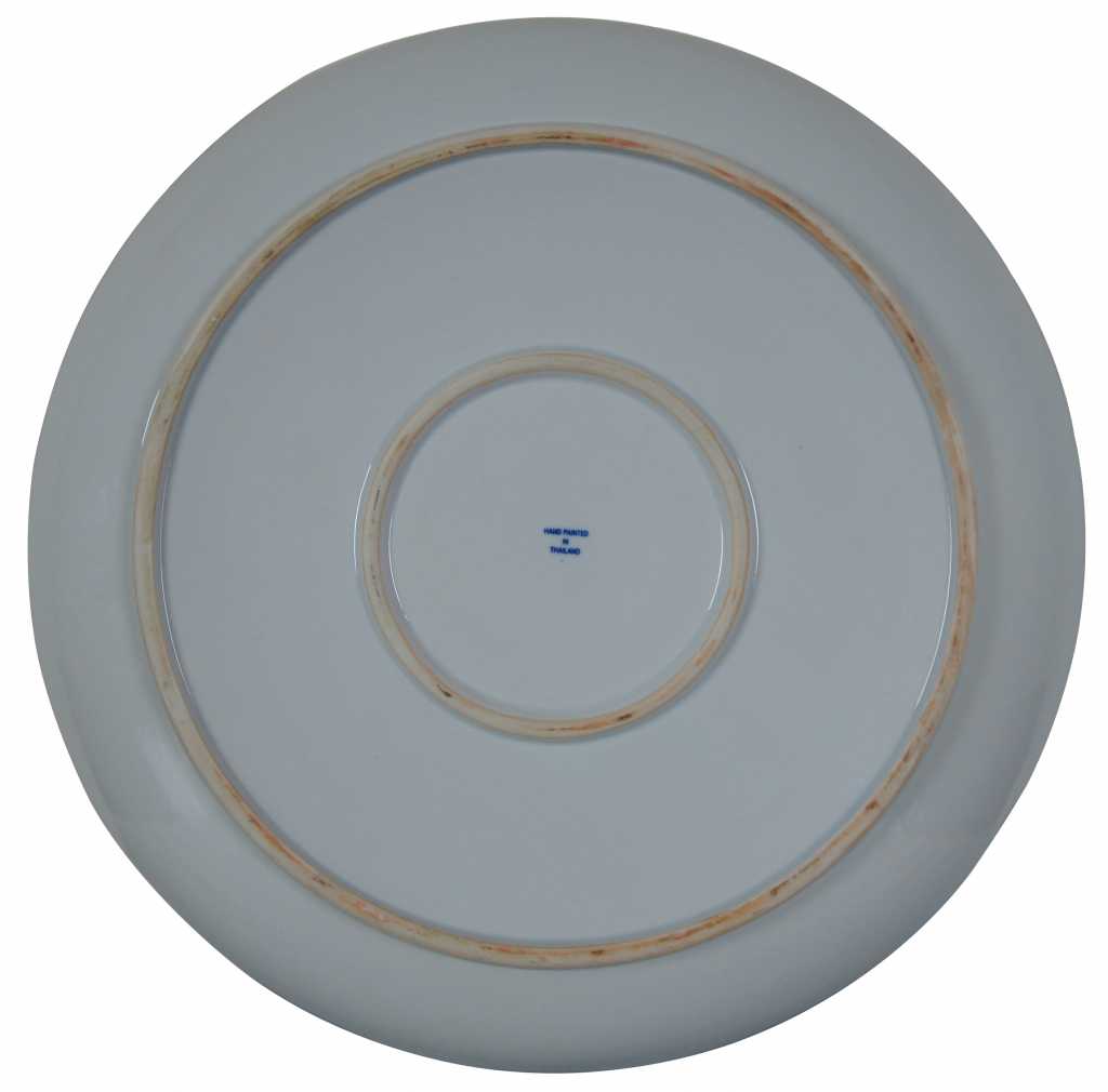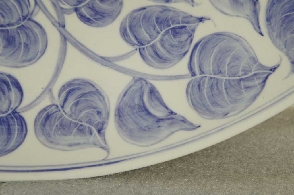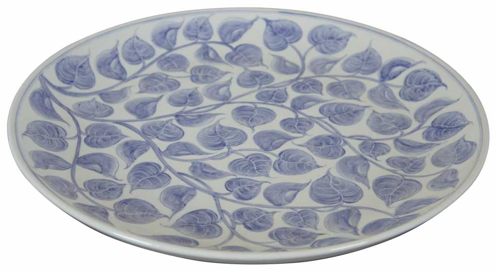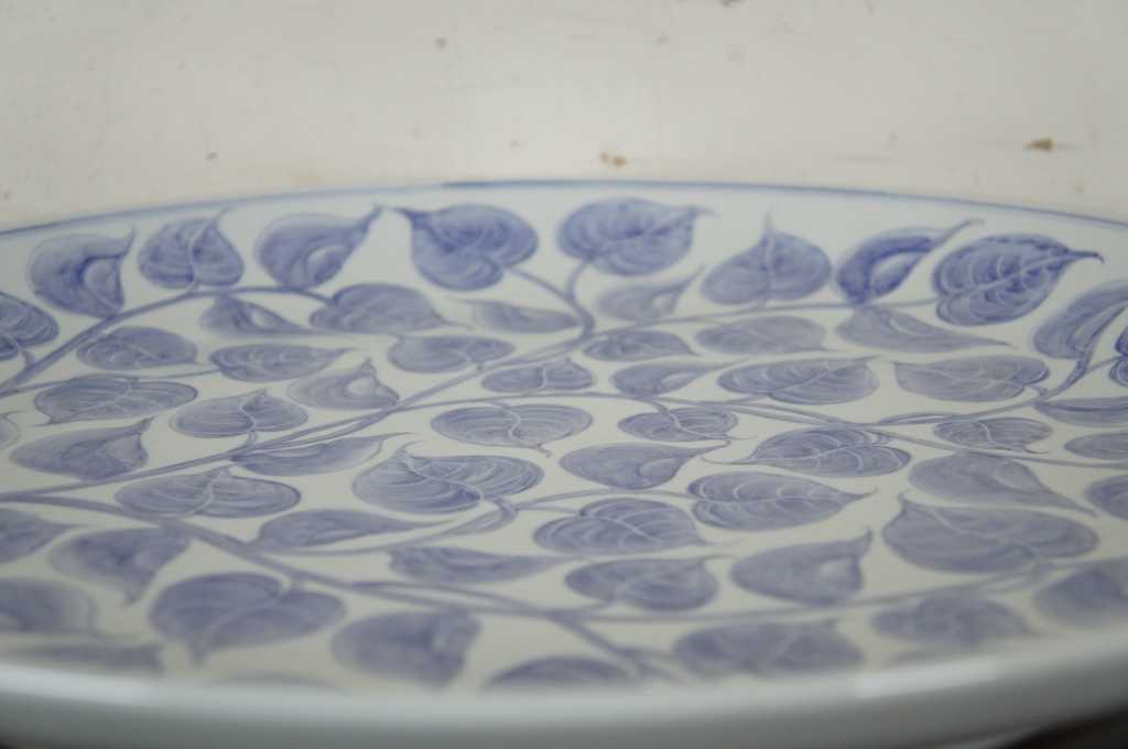 Large porcelain blue and white handpainted charger. Features a intricate leaf pattern, made in Thailand.