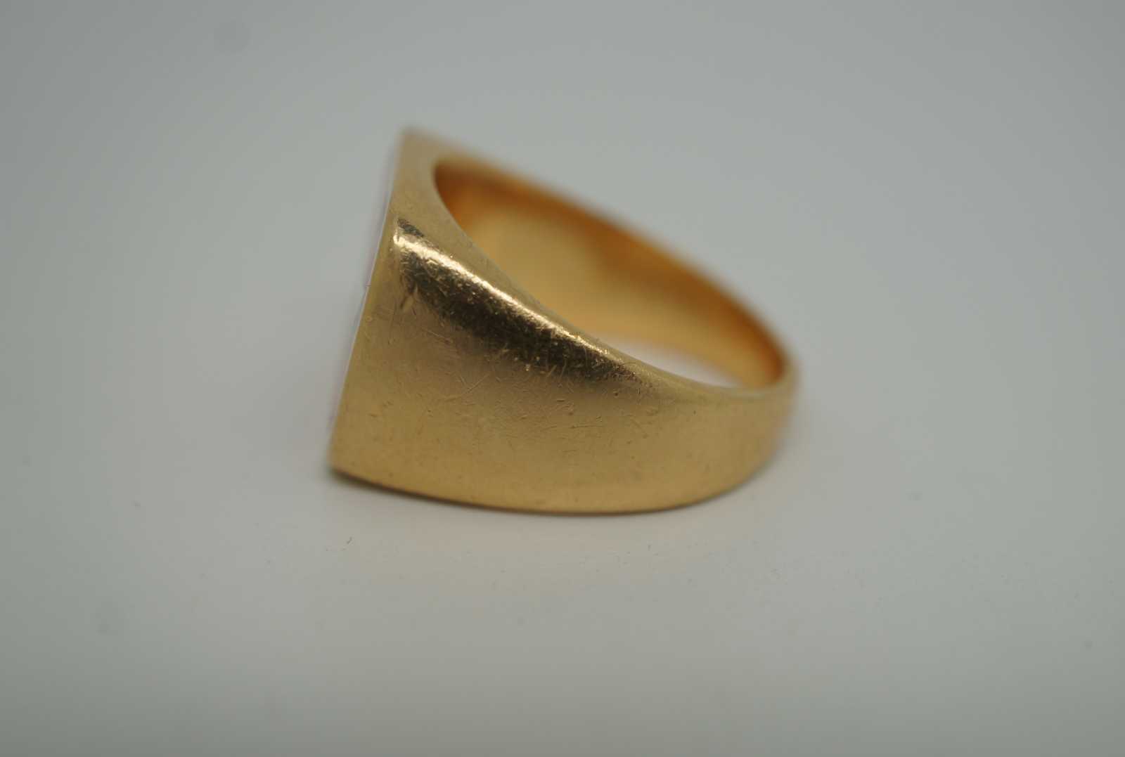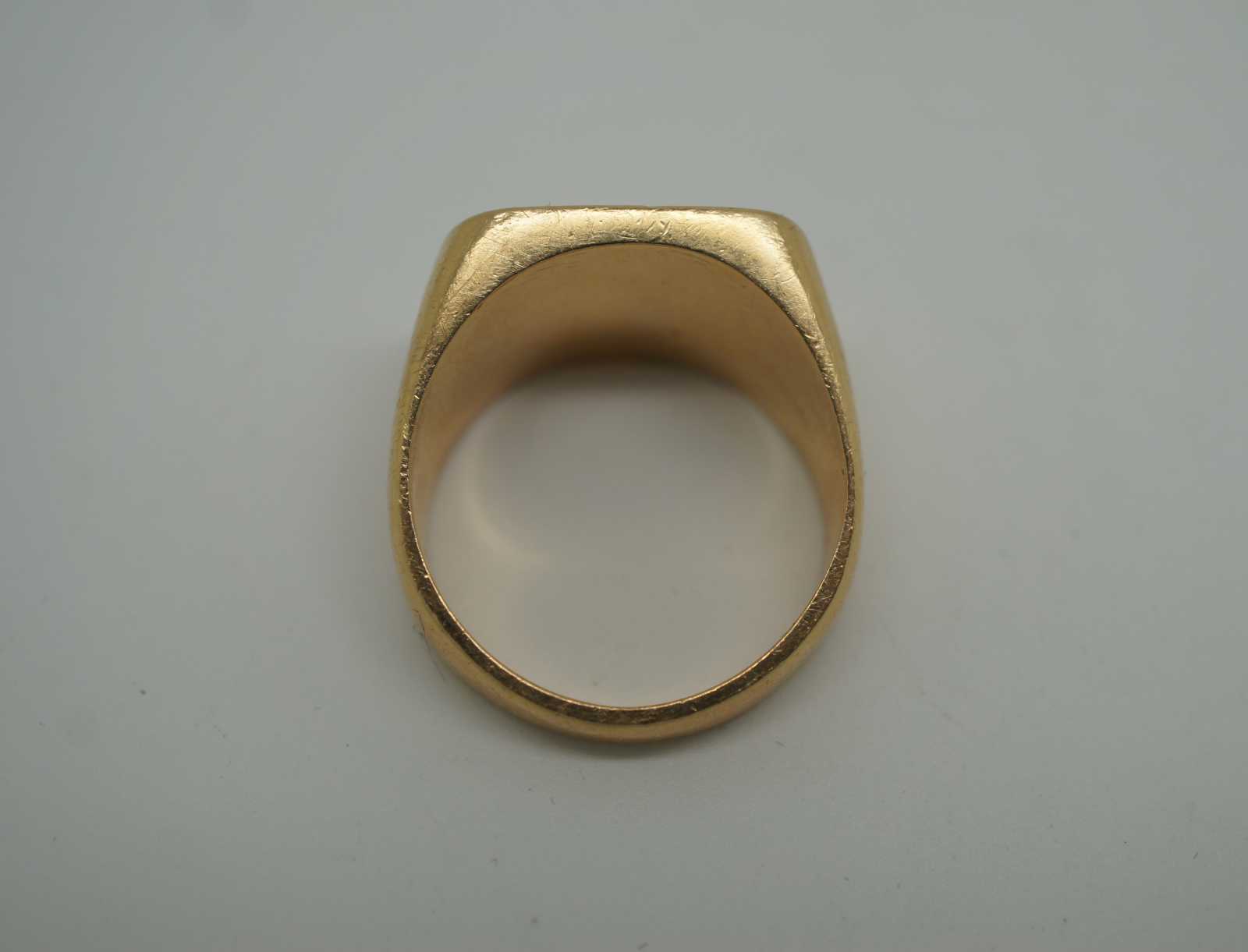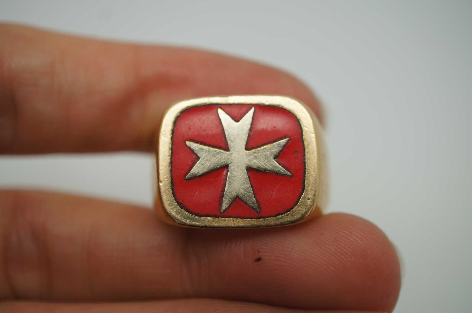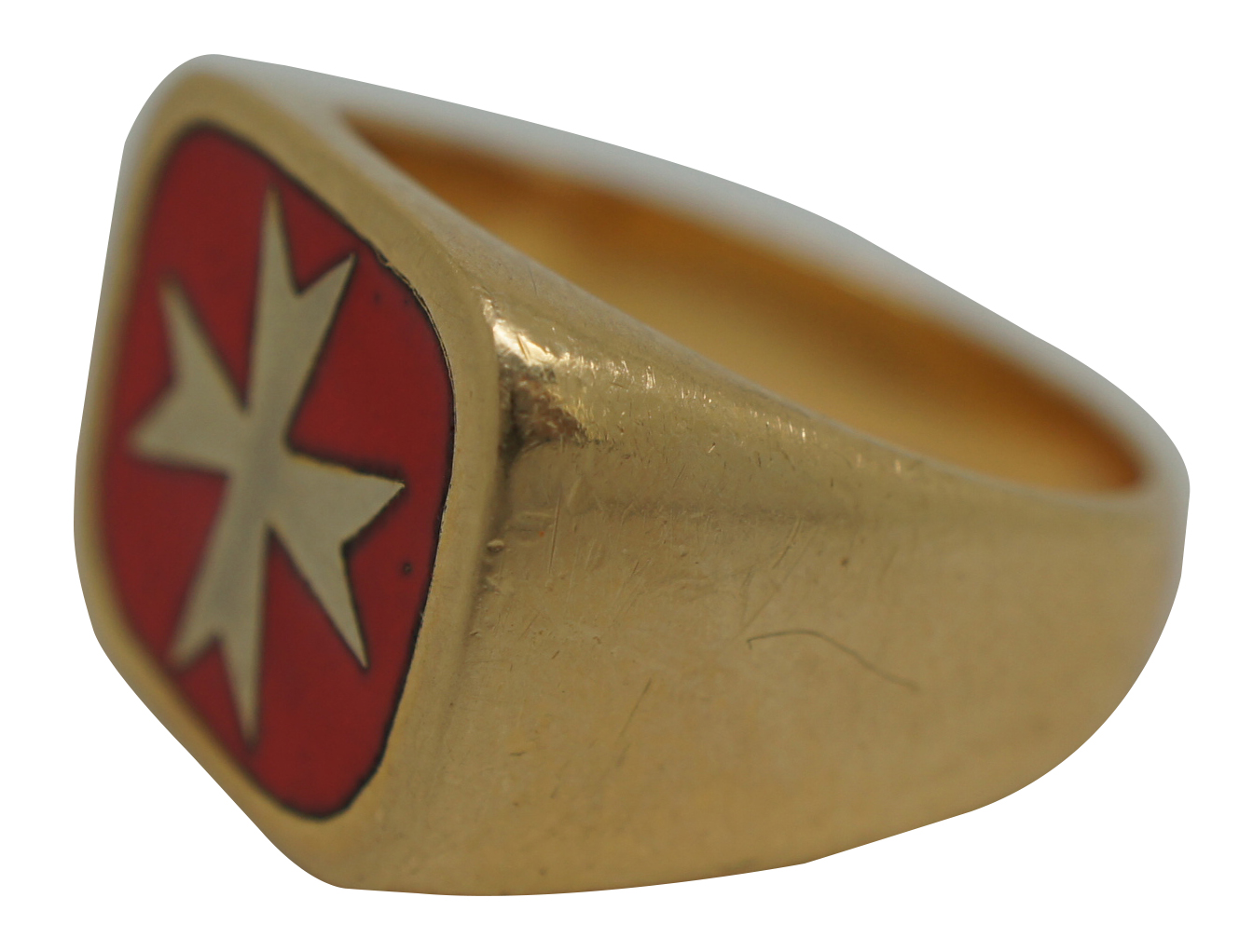 Vintage 14k gold Maltese Cross ring. Features red enamel setting with Maltese Cross. The Maltese cross is a cross symbol, consisting of four "V" or arrowhead shaped concave quadrilaterals converging at a central vertex at right angles, two tips pointing outward symmetrically. It is a heraldic cross variant which developed from earlier forms of eight-pointed crosses in the 16th century.