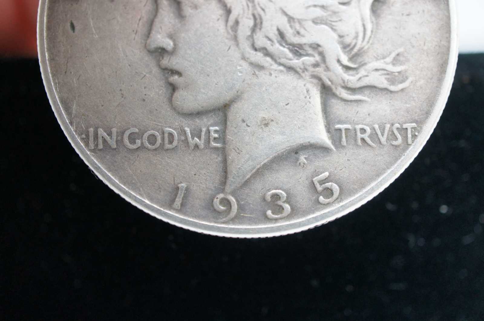 Lot of 5 coins, Morgan Silver & Peace Dollars, 1887, 1935, 1921, 1922, 1928. 90% silver coins.
