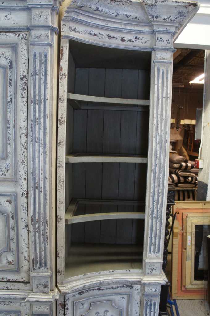 Italian inspired distressed white media cabinet with bookcases. An architectural design with four raised and fluted columns along the front. Features paneled doors with floral scrolled deisgn. Side bookcases have three adjustable shelves with glass inserts. Doors recess for video viewing.