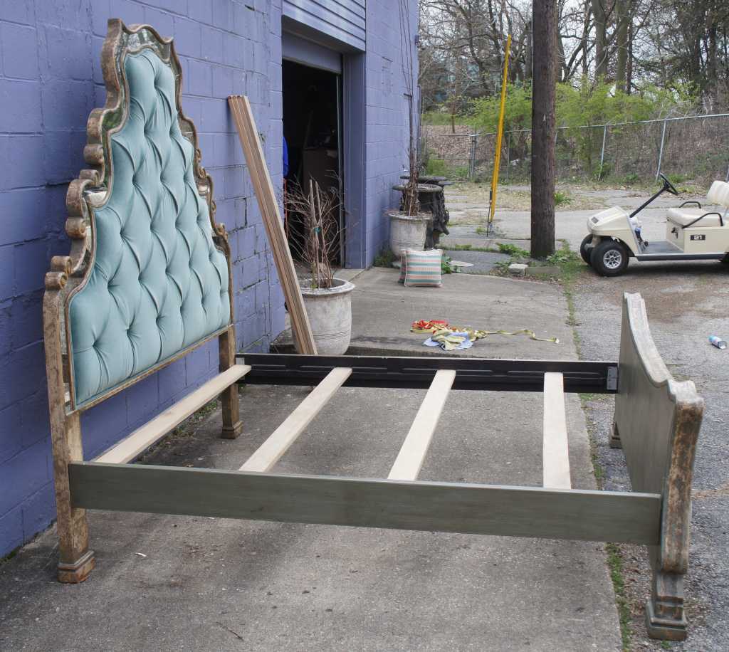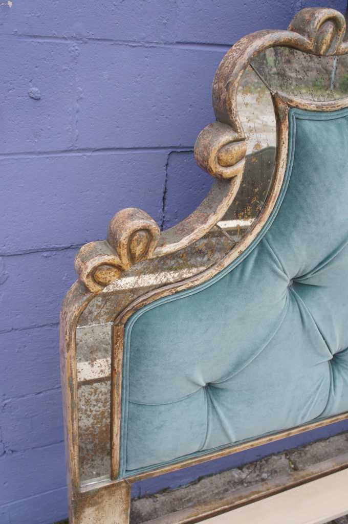 Monumental Venetian style Versailles king size bed frame. Features antiqued and distressed mirrored frame with teal green tufted velvet.