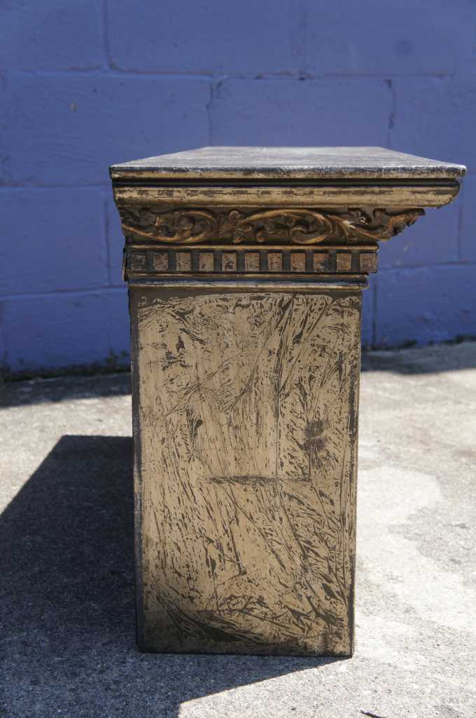 Venetian style antiqued gold architectural wall display shelf. Features ornate mounts and mirrored French Neoclassical accents. Inspired by the hall of mirrors in Versailles.