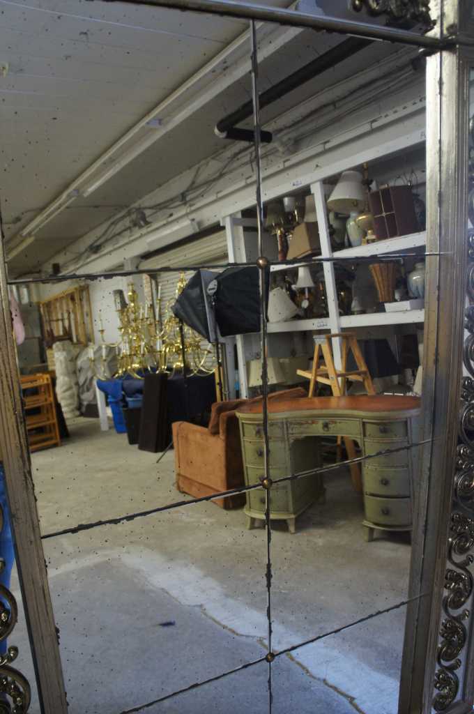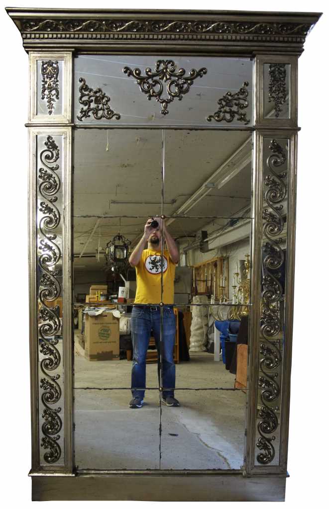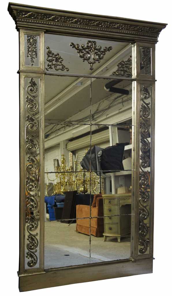 Venetian style antiqued rectangular full length or over mantel mirror. Features a distressed finish with ornate molding and paneling. Inspired by the hall of mirrors in Versailles.