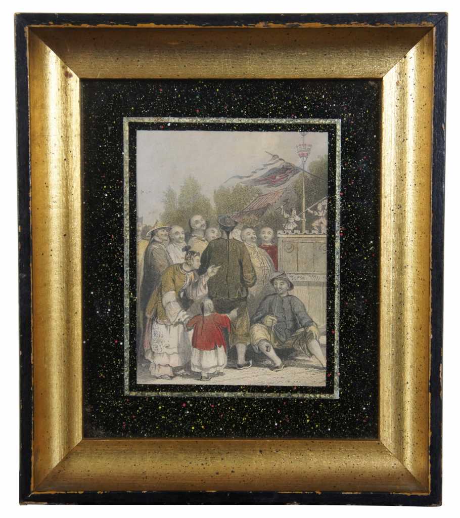Two miniature antique hand painted traiditonal oriental engravings. Features a street scene showing a street musician and festivities. Each is neatly framed in gold with a black spattered mat. Marked C&R masterpiece.