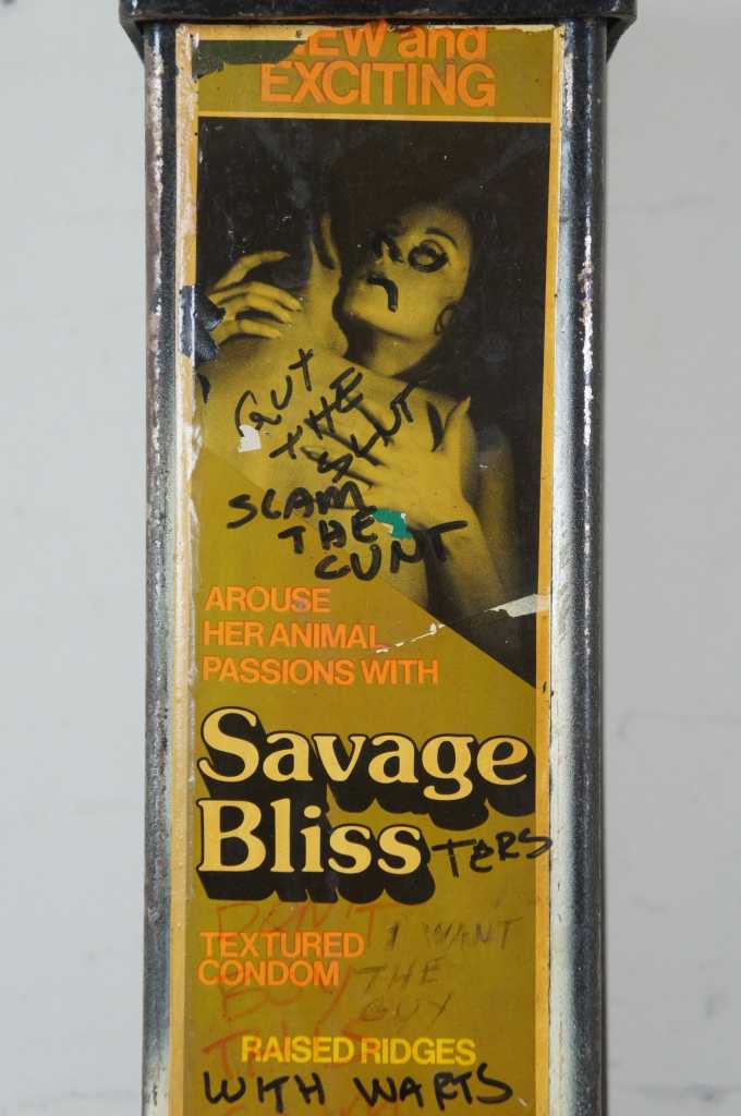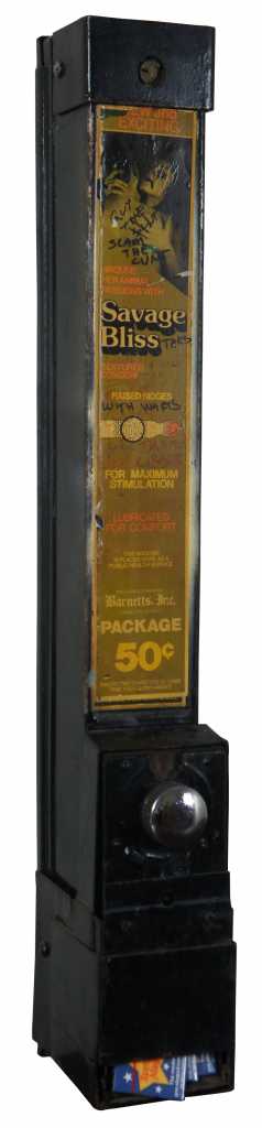 Savage Bliss condom machine and extra Evening Magic condoms (expired, unopened). Machine label has vulgar graffiti writing scribbled on it.