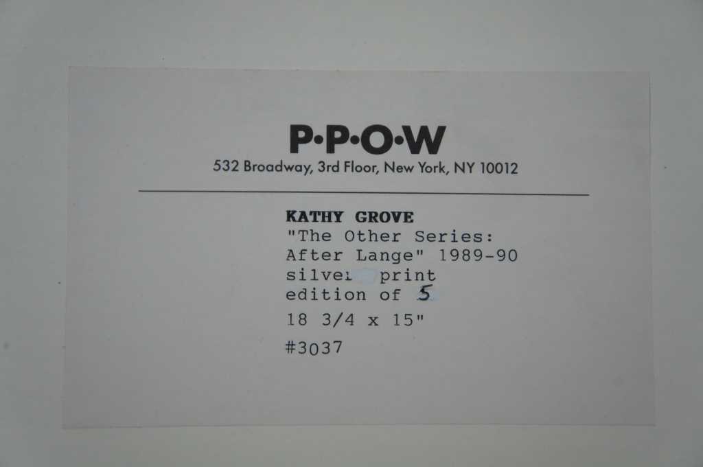 Kathy Grove (born 1948) is an American conceptual feminist photographer. As a professional photo retoucher for fashion magazines, Grove became familiar with airbrushing and photo manipulation techniques in that industry.Her work uses those skills to remove subjects from iconic works, or to alter their appearance. Grove wrote that this practice is intended to ""portray women as they have been regarded throughout history, invisible and inaudible.