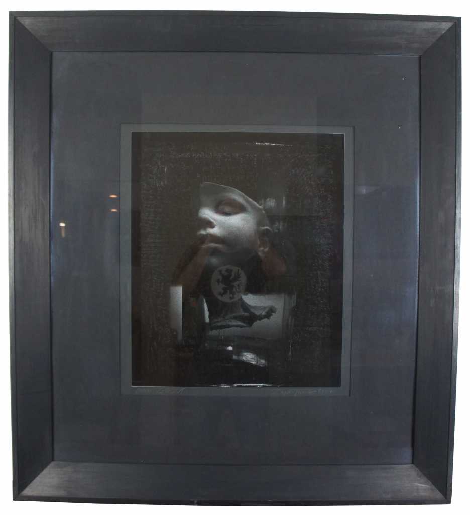 Piameter Dystopia, 1987 by the feminist artist Orshi Drozdik, born 1946 in Hungary, but currently based in New York City. Features 2 large format black and white photographs of a head in a jar. Framed in black with black mat. Pencil signed with label along the back.