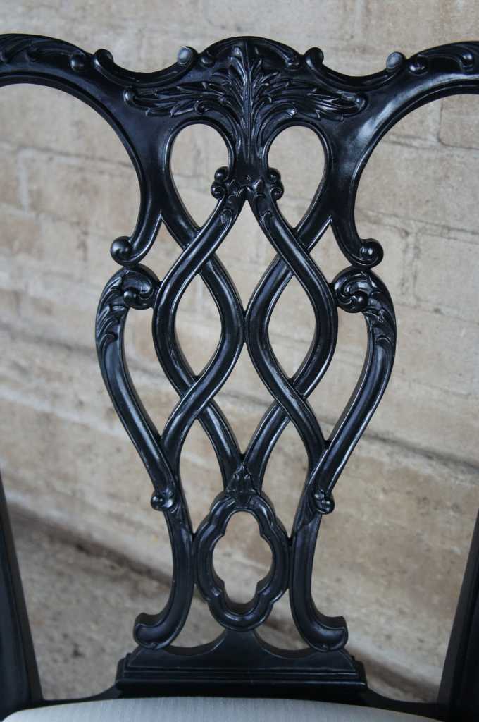 Pair of vintage mahogany chippendale style arm chairs. Features a black painted frame and white striped seat cushion.