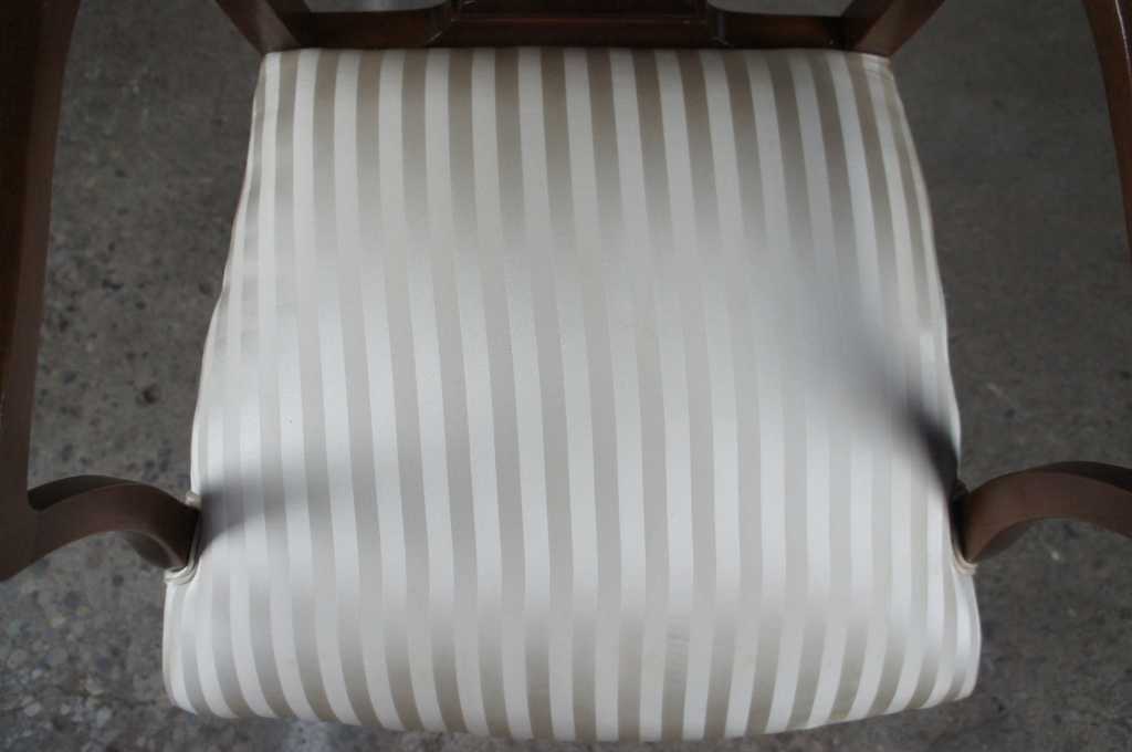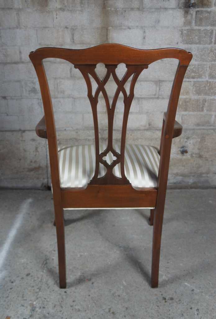Beautiful antique chippendale style mahogany arm chair. Features dark wood and striped cushion.