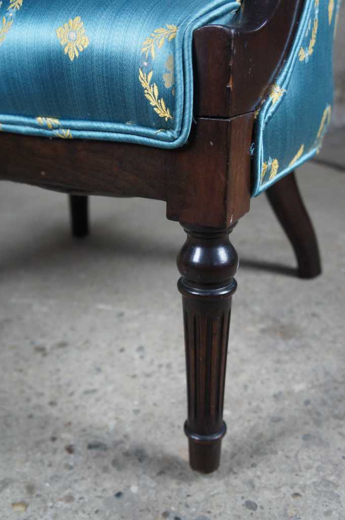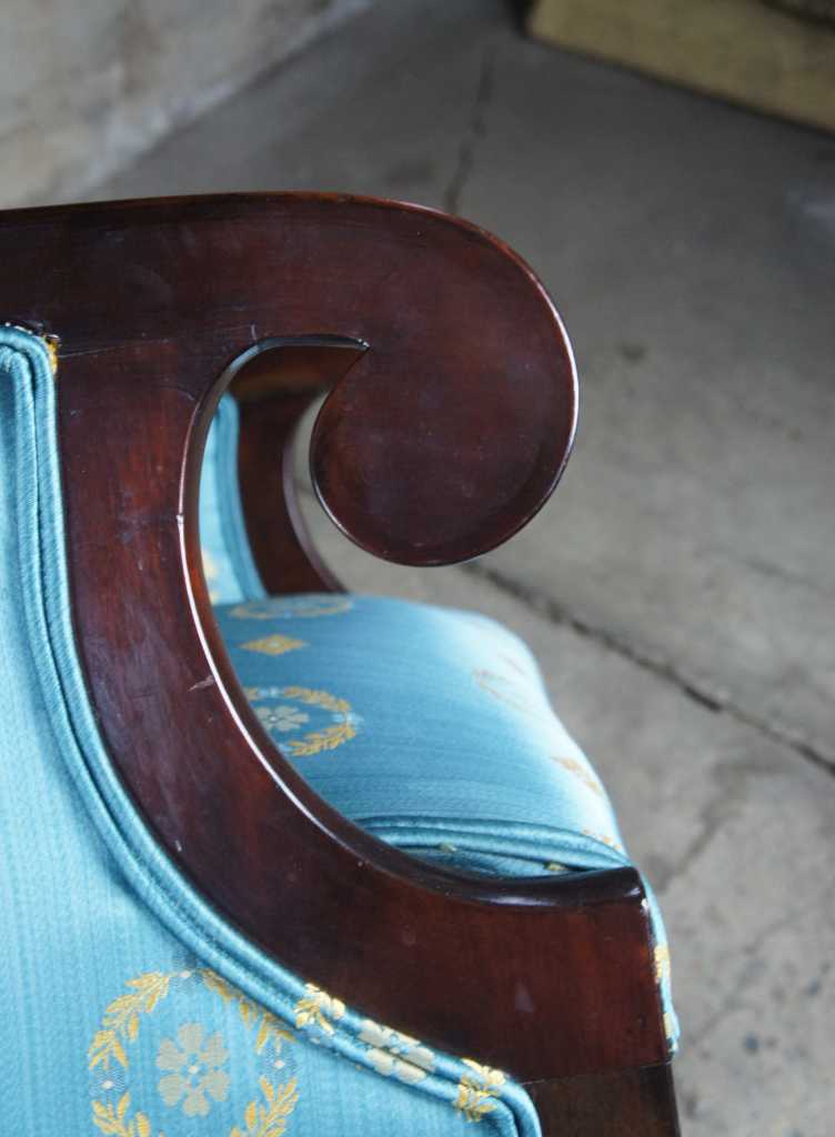 Circa 1920s American Empire style club chair. Features a curved back leading to scrolled arms, over turned and fluted legs. Uphosltered in a blue and gold silk scalamandre fabric.