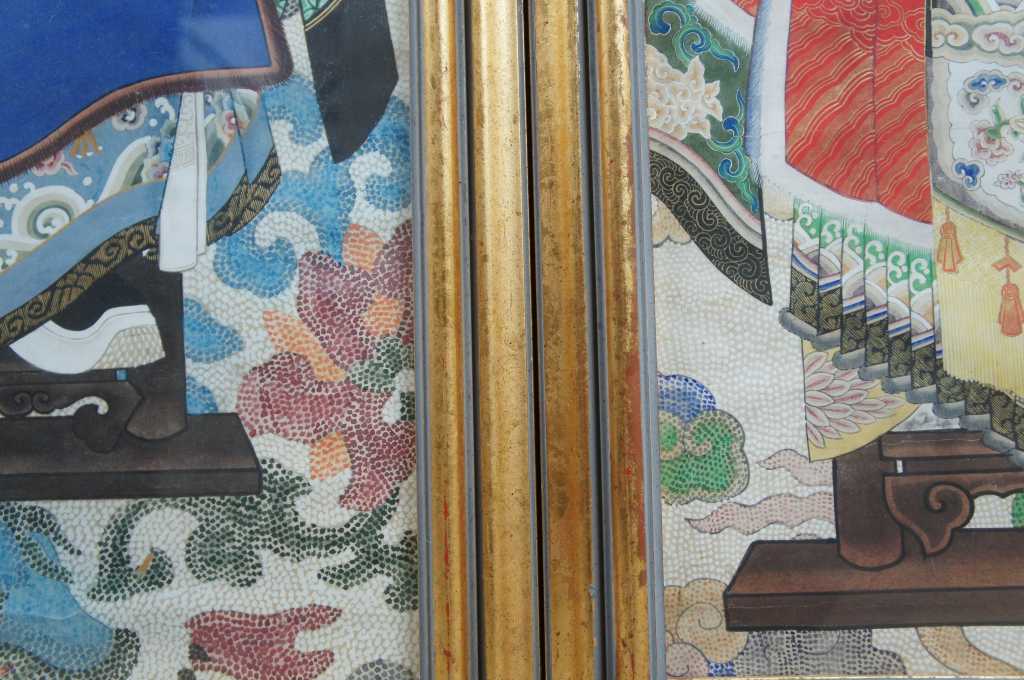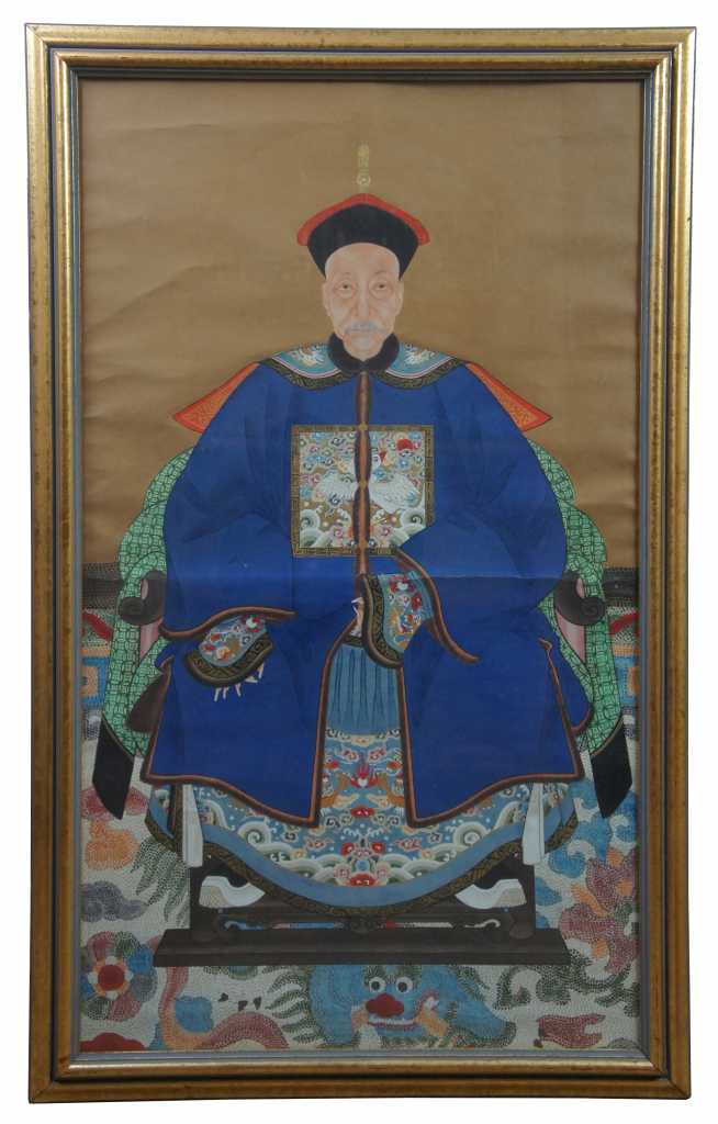 Pair of two late 19th century Chinese ancestor portraits, features and emperor and empress dressed in traditional robes. Features imagry of foo dogs, dragons, pheonix, and other colorful details.