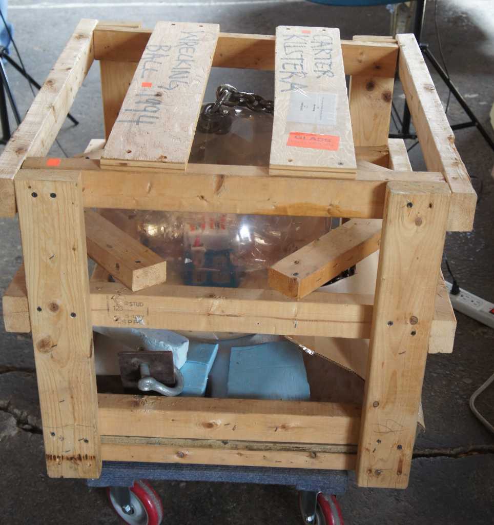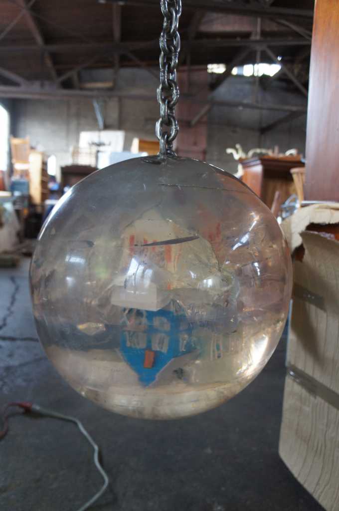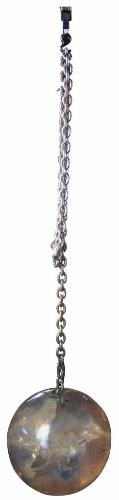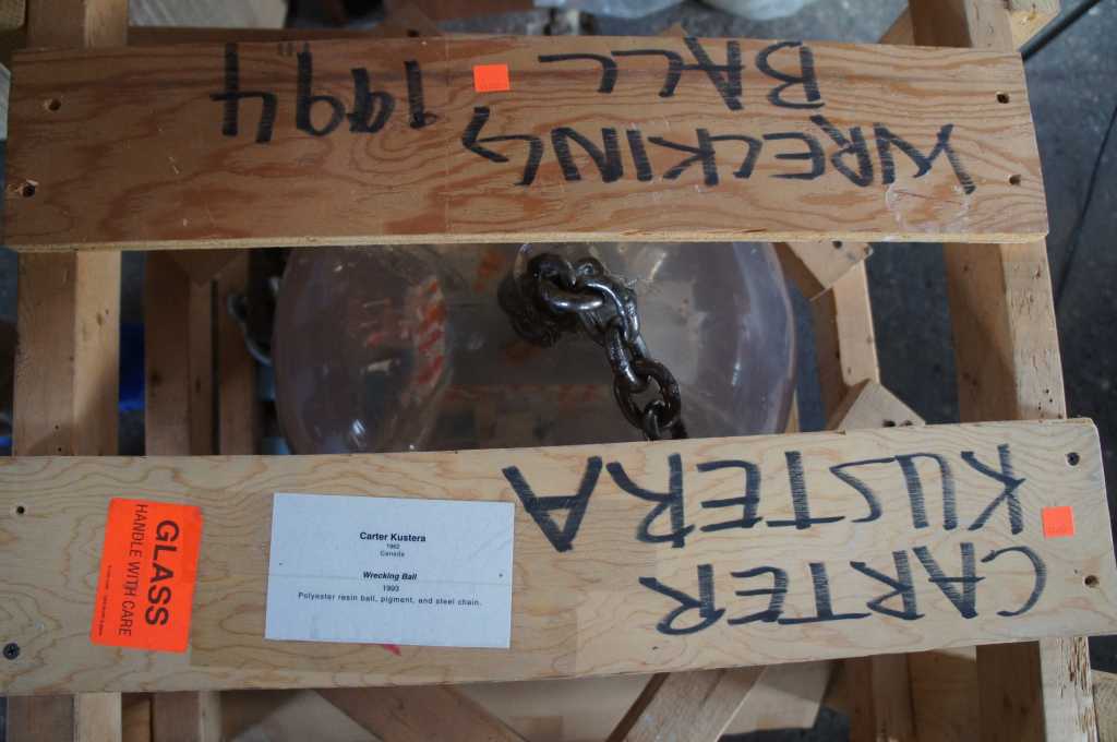 Carter was born in Canada in 1962. In the early 1990s, Carter began exhibiting his art sculptures in galleries. The Wrecking Ball was one of his early installations and features a polyester resin ball with miniature dimensional fiber homes colliding on the interior. Furniture and people can be seen spattered about. The demolition ball is connected to a heavy 9' steel chain that anchors to a ceiling with a cast iron support.
