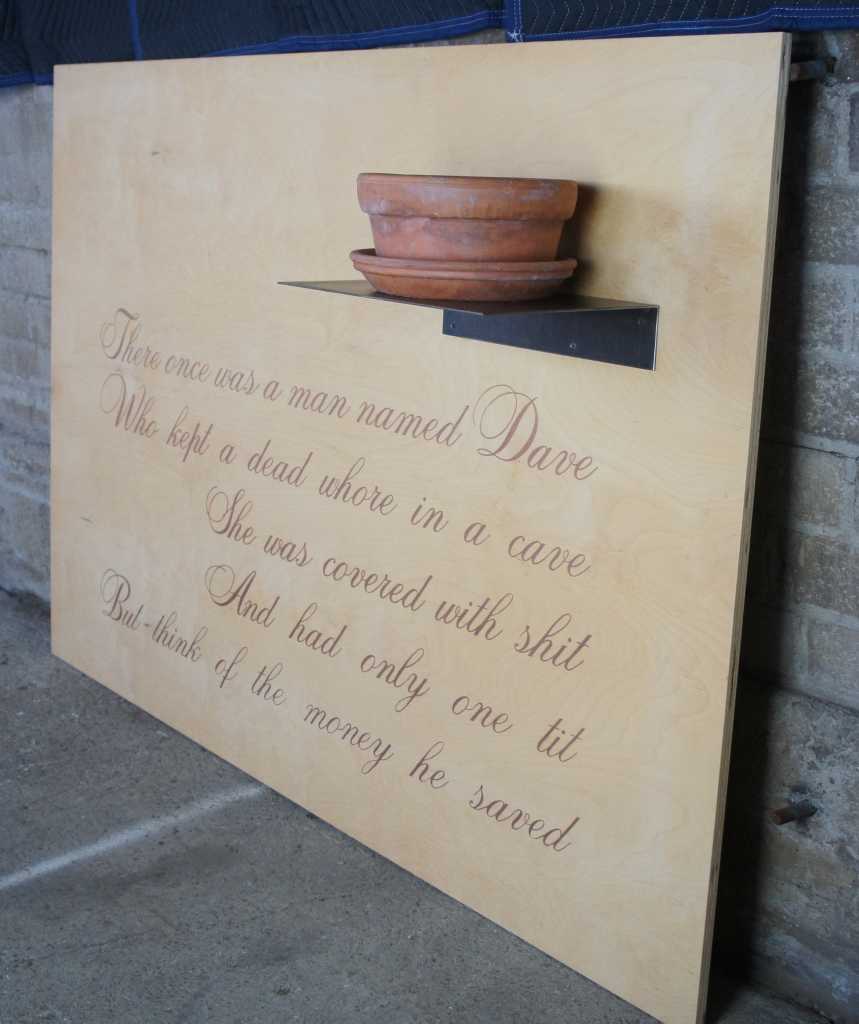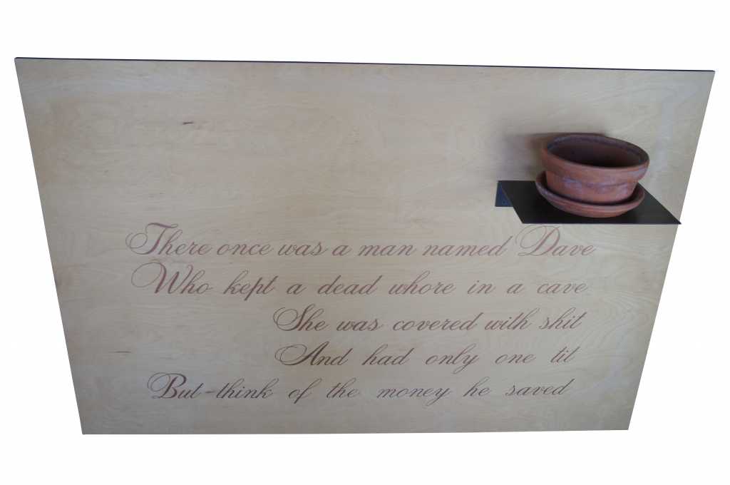 1992 Mixed media by Susan Silas, from the Exquisite Corpse Series. The pot and saucer are for a Hedera Ivy plant that would have adorned the original piece in the exhibit. The classical font or text is painted in a light purple tone ink on wood. ""There once was a man named Dave Who kept a dead whore in a cave She was covered with shit And had only one tit But think of the money he saved"". Susan Silas (American, b. 1953)