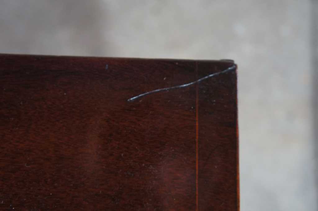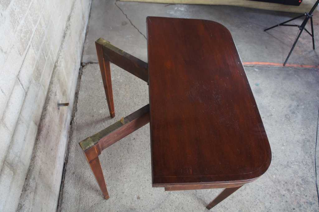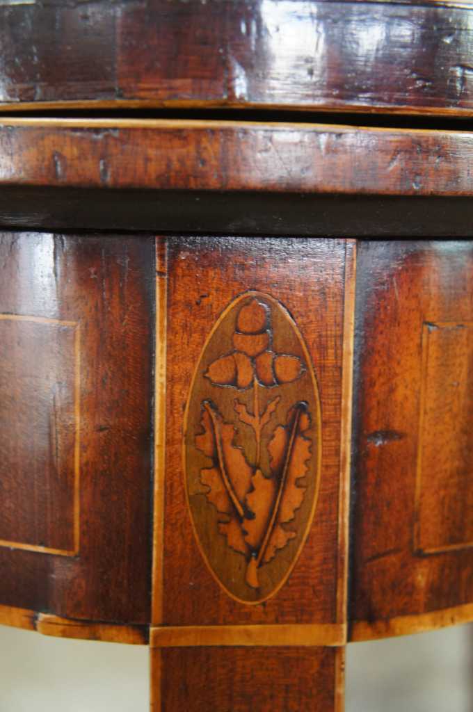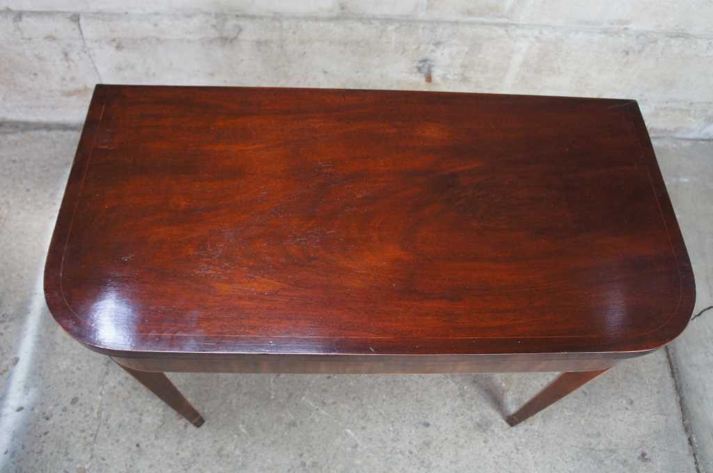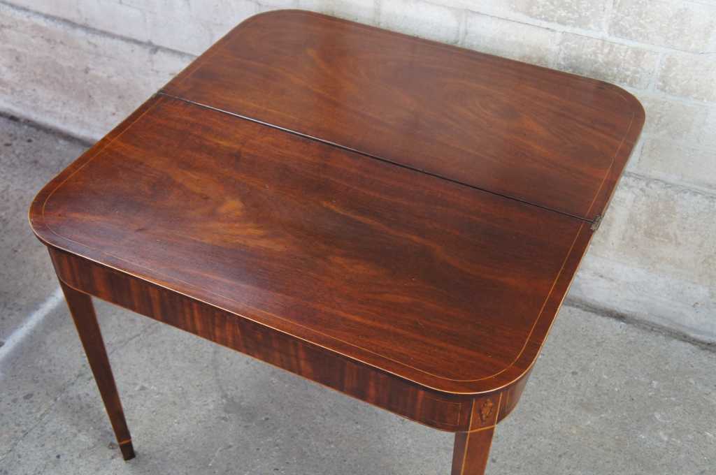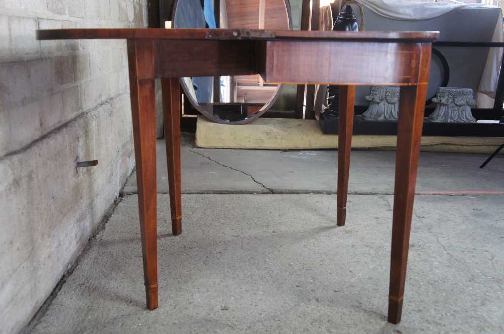 Early 1800s Sheraton inlaid mahogany game table. Great for entry or parlor, opens to game surface. Framed in ilanys with marquetry fruit and nut design over tapered legs.