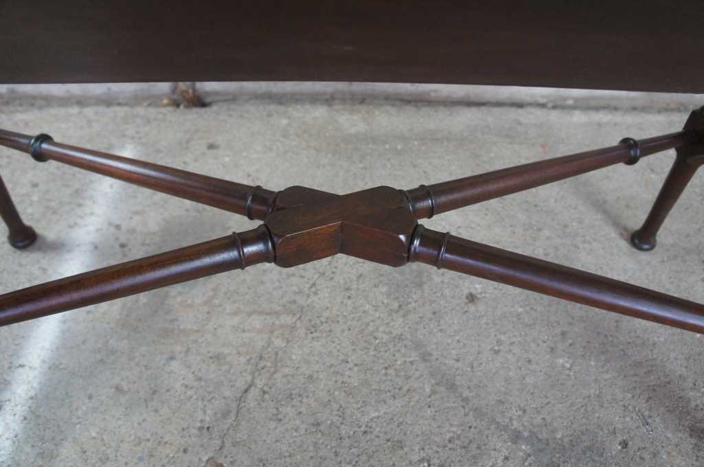 With narrow rectangular polished top over a canted book trough with four divisions. Concave, swept mouldings over X-framed ends. Stand upon tapered, turned legs which terminate with pad feet, united by X framed baluster turned stretchers.