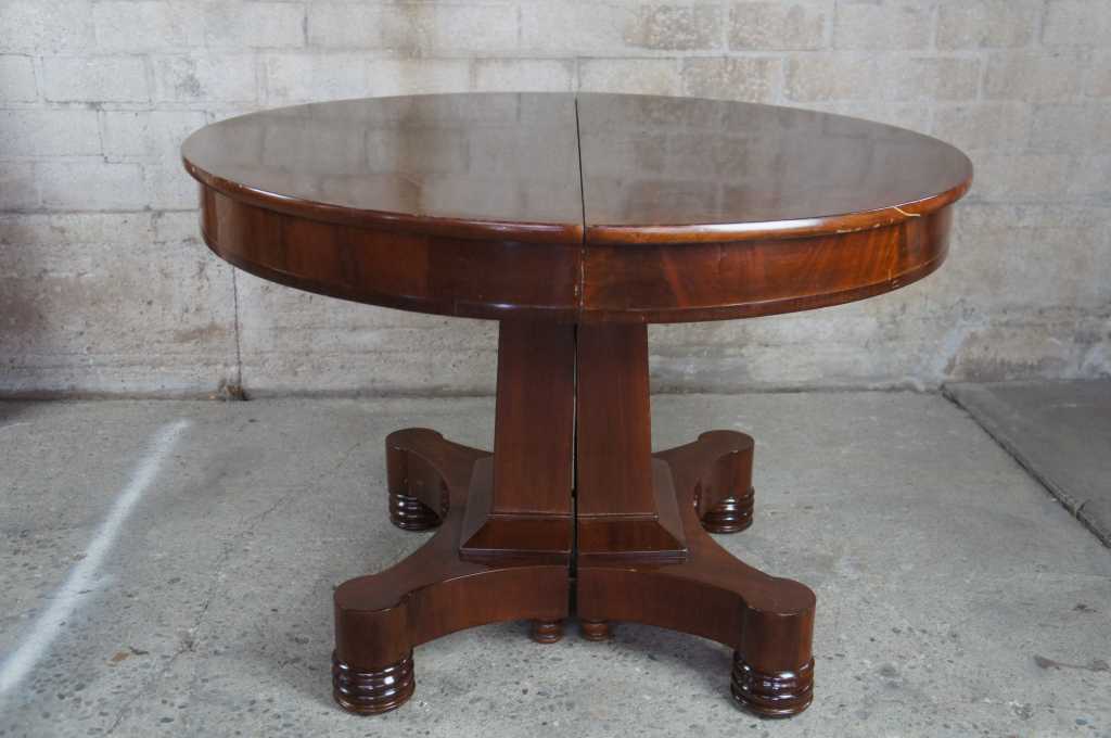 Mid 19th century American Empire dining table. Made from mahogany with split base, extendable with two leaves.