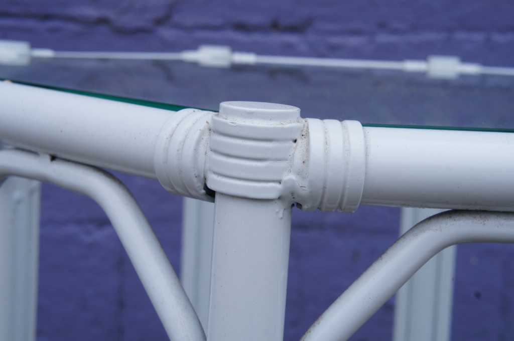 Octogon side table with elegant glass top. Rattan-style tables make a great addition to smaller spaces between furniture. Crafted from rust-resistant cast aluminum with a glossy finish that is designed to endure the harshest weather.