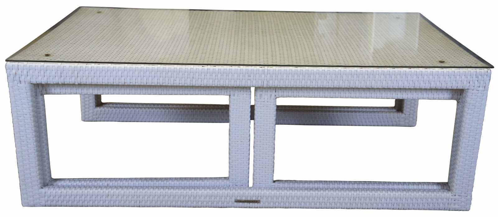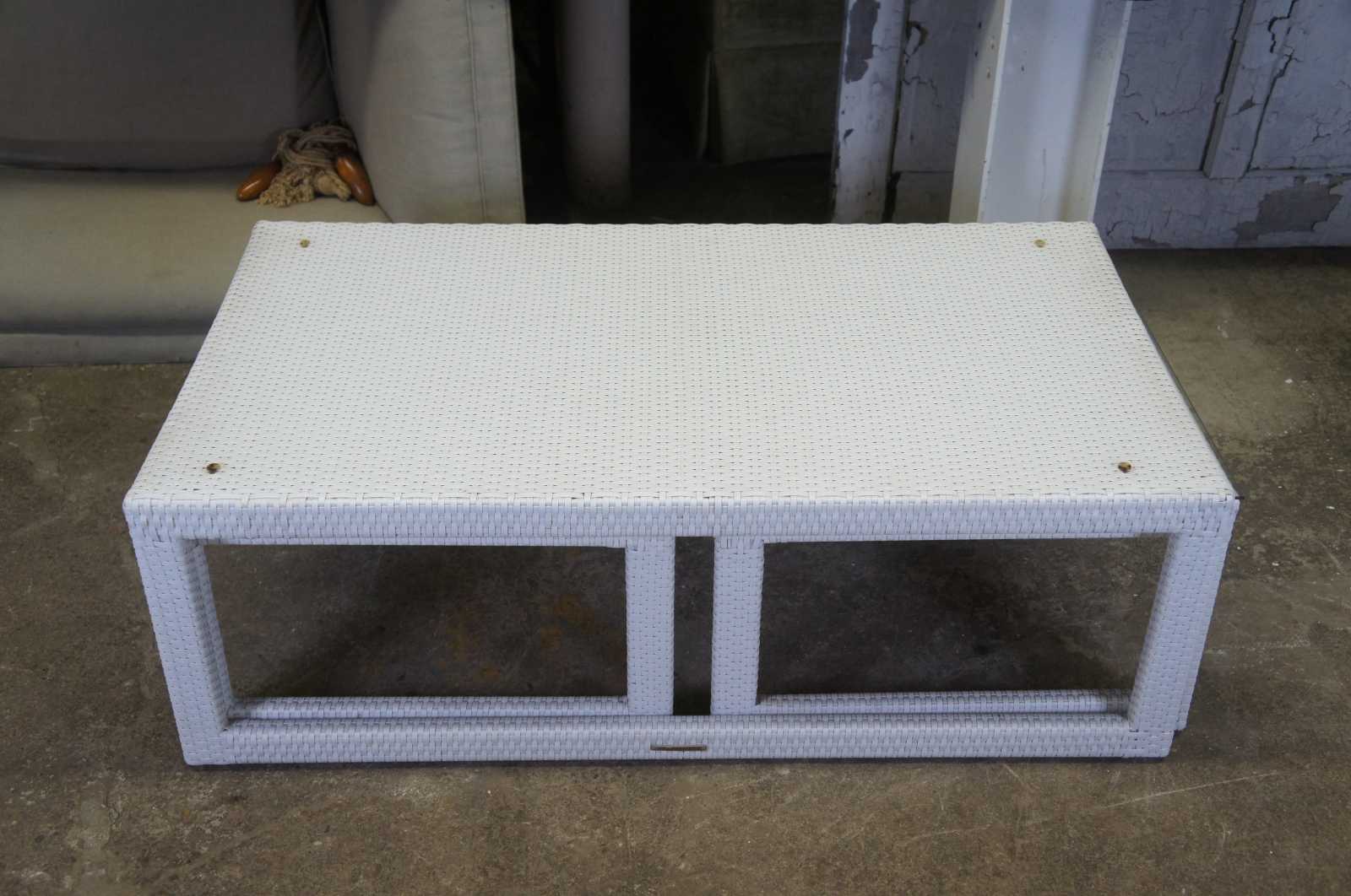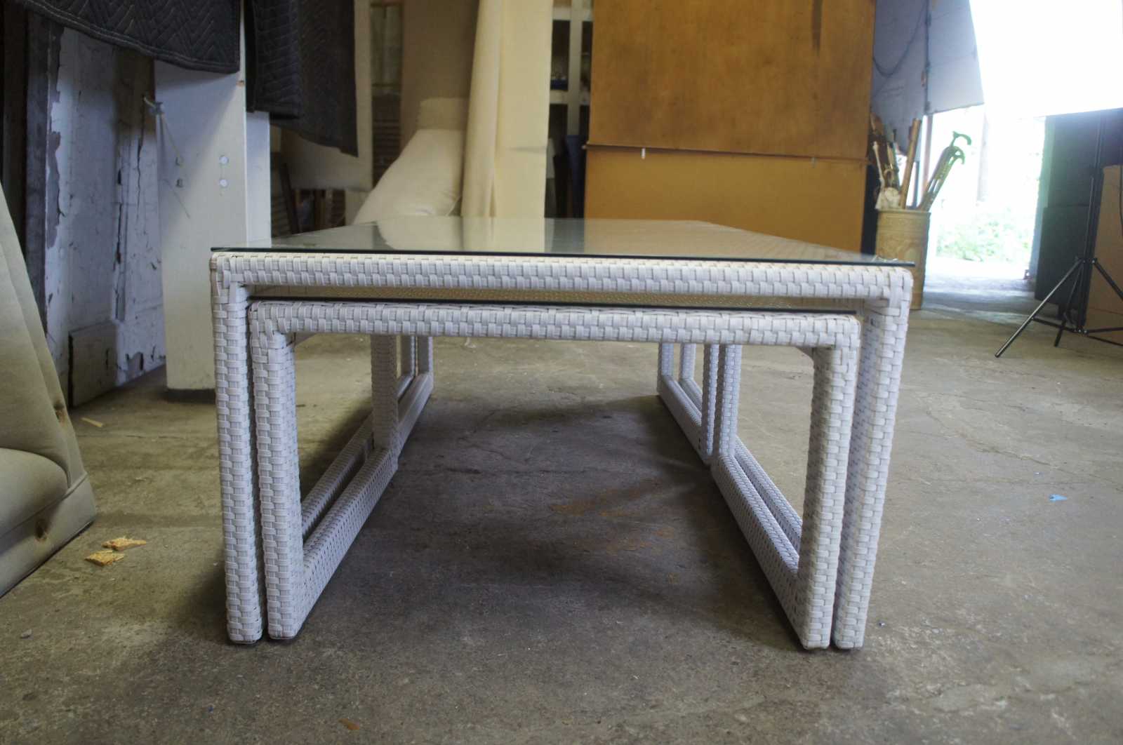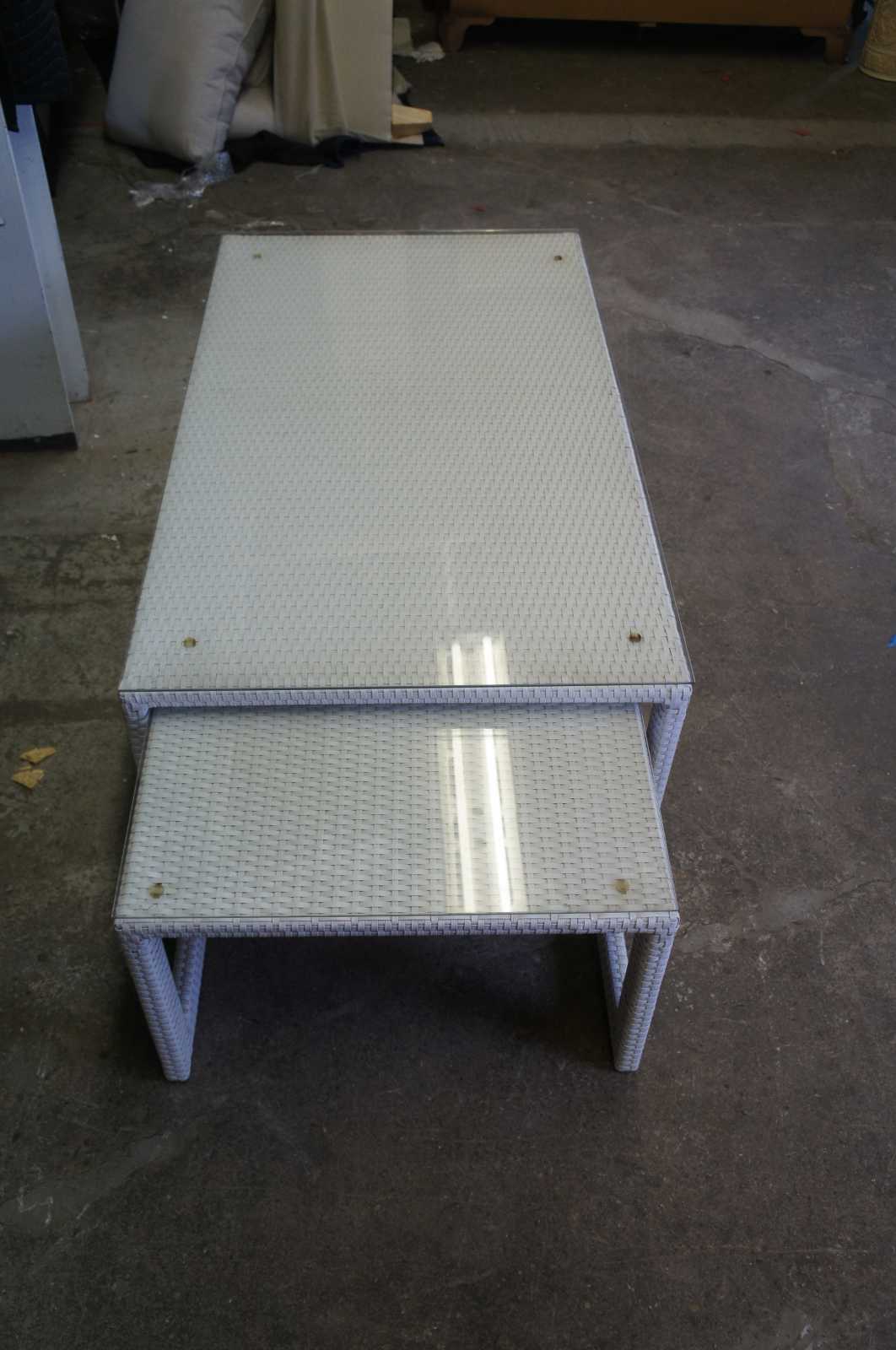 Palermo Nesting glass-overlay coffee table set. Features three piece; two small square tables neatly tuck below the rectangular coffee table. All three tables are wrapped in wicker, feature sleigh legs, glass top.