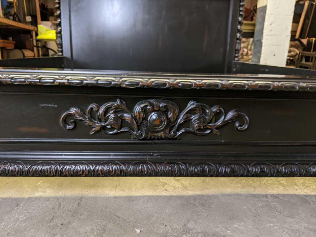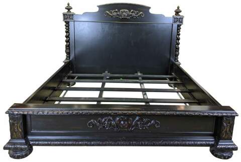French style panel bed by Restoration Hardware. Features ornate hand carving and bun feet. From the second Empire-inspired bedroom collection – a mid-19th-century French style characterized by the use of rich woods and decorative molding. Carefully hand-finished using an 11-step process that imparts subtle highlights.