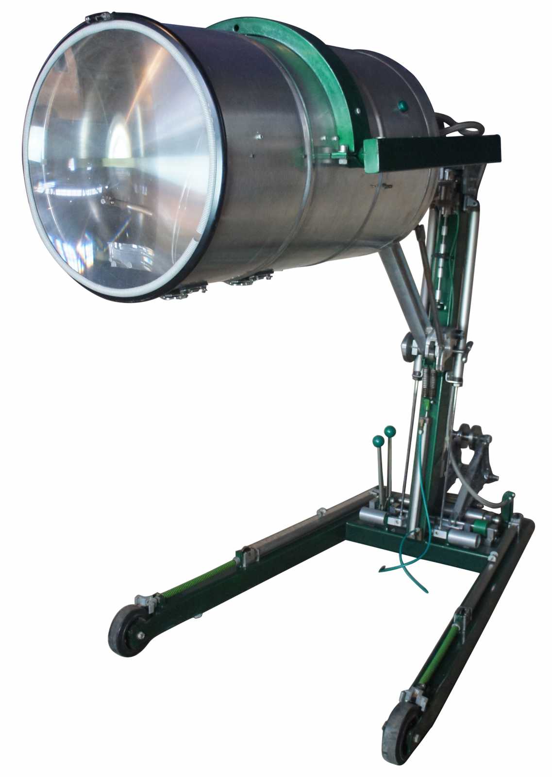 TODT lifesize art installation sculpture, titled Barrel Lift, 1993. One of a kind art sculpture by TODT. Features a green barrel lift with metal drum. If you plug it in and look through the drum, you will find a sci-fi scene complete with test tube alien remains / replicas and illuminated crosshair. For more than thirty years TODT has created provocative and challenging installations that focus on the historical, social and political implications of the present. Originally based in New York City, the collective relocated to Cincinnati in the mid-eighties to, ""expand and establish a more centralized studio and materials supply source."" Their mid-west base of operations has proven bountiful providing a wealth of raw materials that serve as the components of the hybrid constructions they create. TODT refers to their collaborative process as one that is ""based on anomaly and anonymous accumulation."" ""TODT is an architecture that continues to explore the immediate experiences of history, sexuality, mimicry, and modern angst. It is an art of structural perceptions – one which regards the object as the realism of ourselves.""