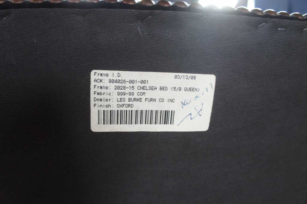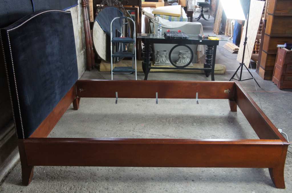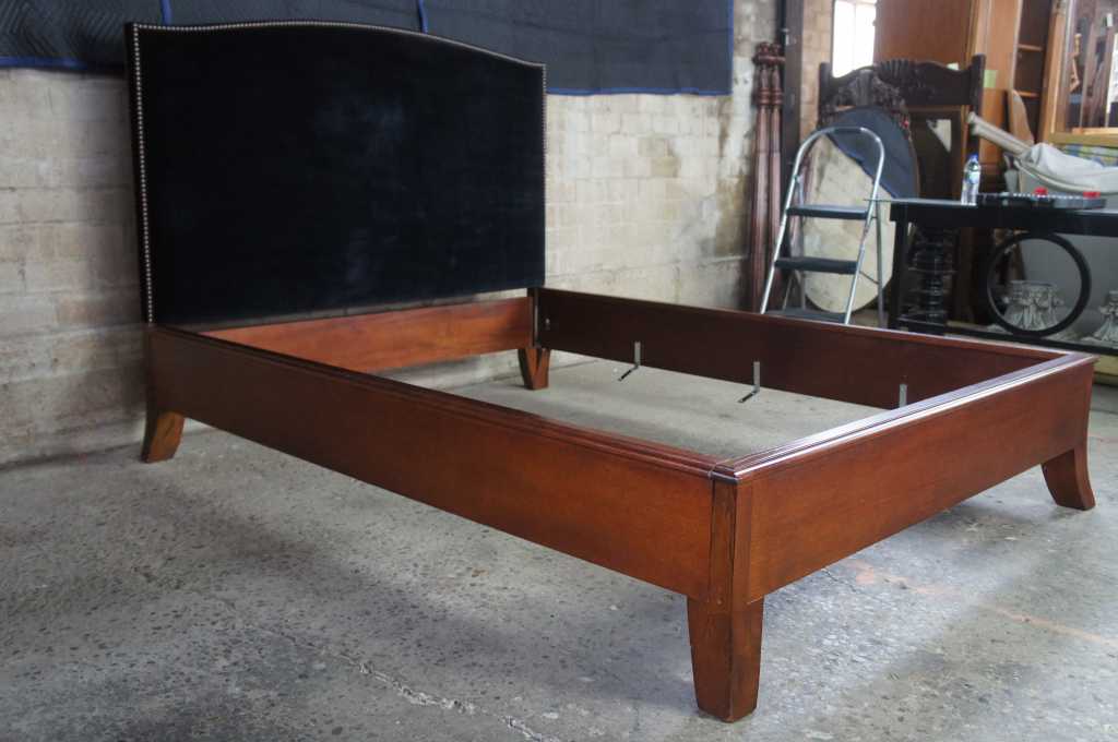 The Chelsea bed by Hickory Chair Co was designed by Thomas O'Brian. , Contemporary, oak frame, Black velvet upholstery with steel nailhead trim, and platform style footboard