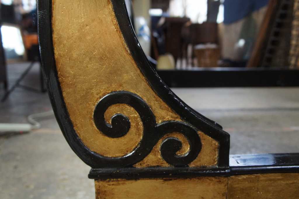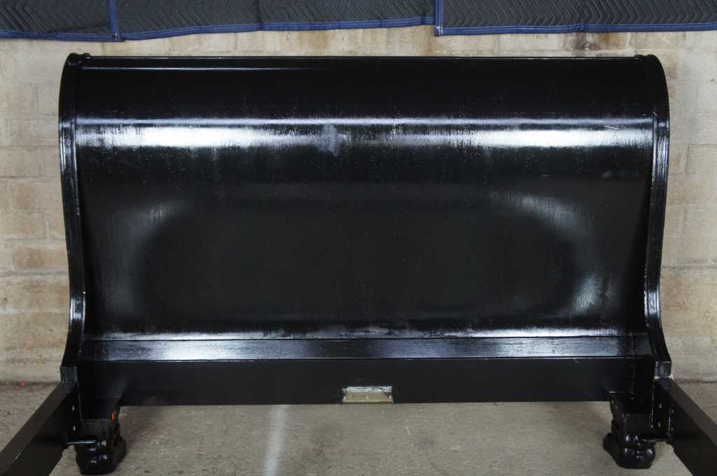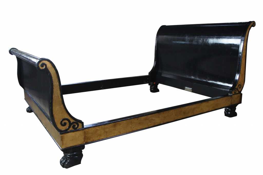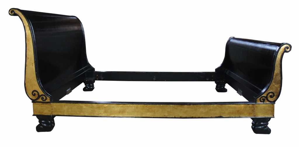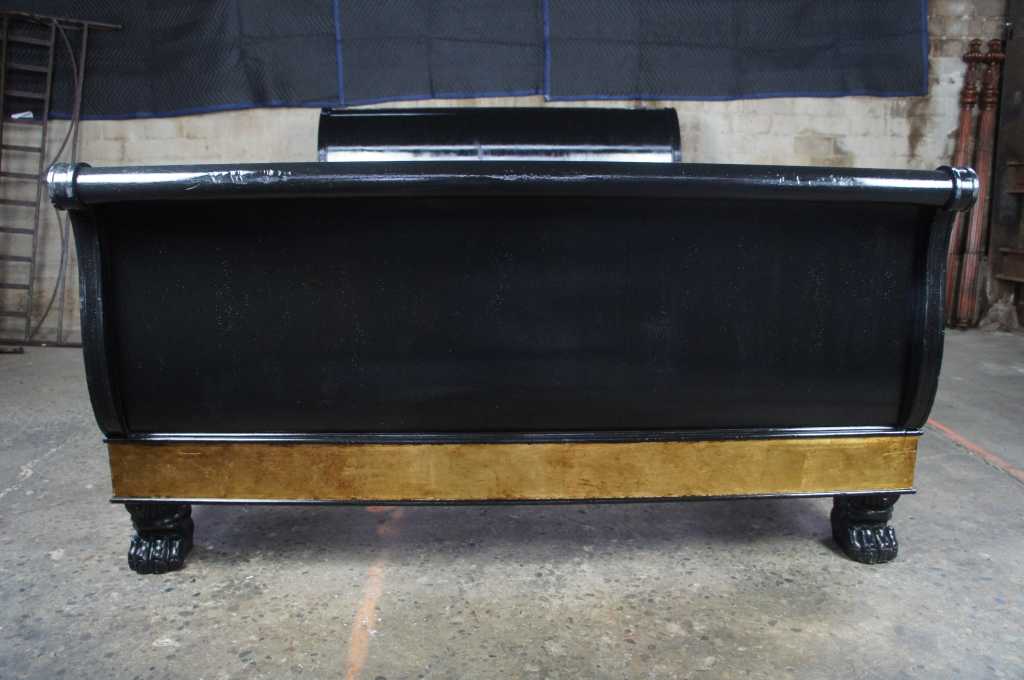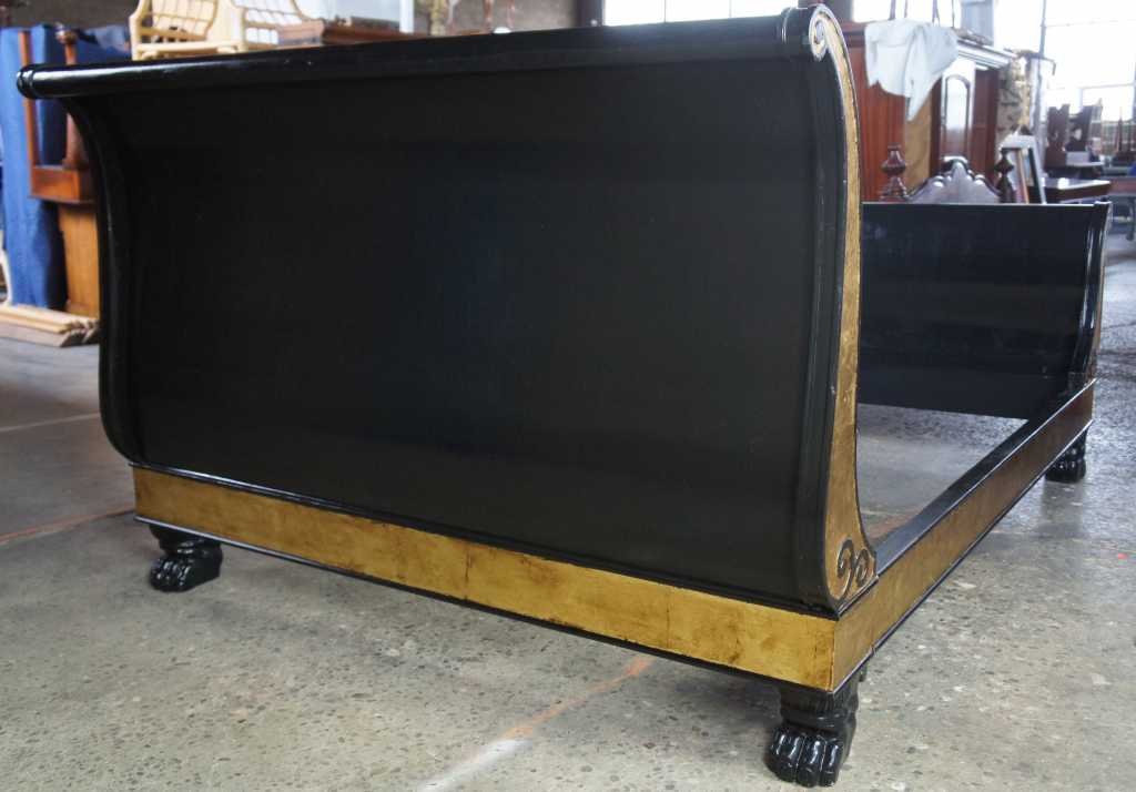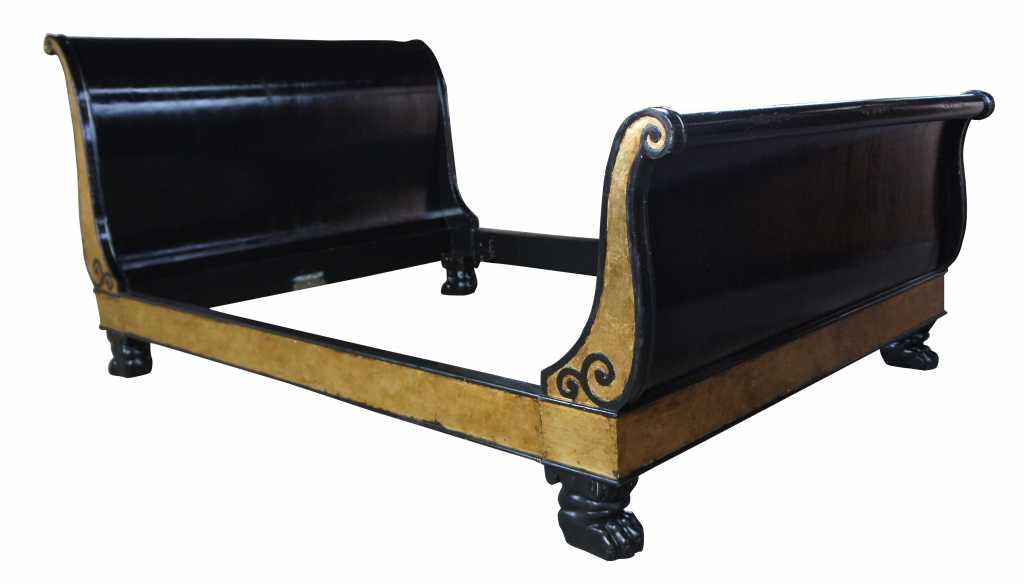 A beautiful french empire inspired sleigh bed. Finished in black and gold with ornate scrolled detail and thick paw feet. Operating for over a century, Baker Furniture is one of the rare brands that have garnered an irrevocable place within the canon of American design and craftsmanship. Established in 1890 in Allegan, Michigan by Siebe Baker, an immigrant from the Netherlands, Baker initially began as a door and cabinet shop, but by the 1920s had begun offering collections of handcrafted modern and art deco furniture. Over the course of the following decades, Baker expanded its practice drastically, growing to include an extensive upholstery division and producing comprehensive collections of furniture. Most notable of their early collections were those inspired by classic English and Chinese silhouettes and motifs. Since then, Baker has continued to draw inspiration from international styles, including French provincial, Danish modern, and others – all executed with the same allegiance to craftsmanship and quality. Baker’s iconic stature within the realm of home furnishings has led to many high-profile collaborations with leading designers, including Barbara Barry, Thomas Pheasant, and Bill Sofield. Today, Baker offers pieces in a multitude of styles from traditional to contemporary, mooring any interior design scheme.