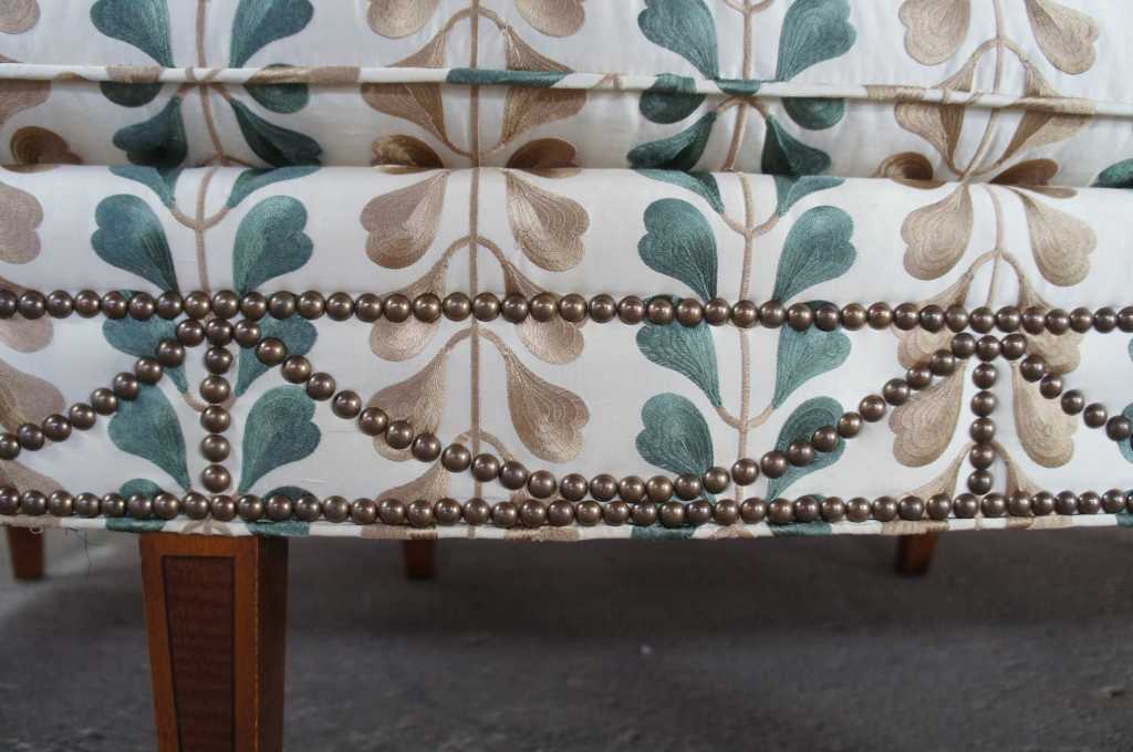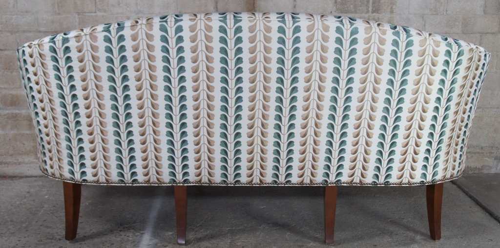 Early Kittinger Bowback sofa in hepplewhite style. Upholstered in Osborn & Little earthy green and gold fabric with nailhead trim. Made from mahogany with tapered and inlaid legs. The graceful lines rely on a subtle sophisticated form which is not overpowering, but beautifully shaped with rear legs that have a very nice outward cant. Note the delicately arched back, which continues to roll down through to the end of the arms, which then turn in to the seat frame.