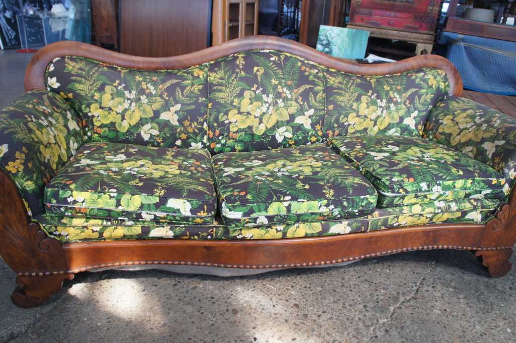 Circa 1850s American Empire camelback sofa. Made from flamed mahogany with flared arms and beaded lower apron. Upholstered in a green and black jungle theme fabric that needs to be replaced.