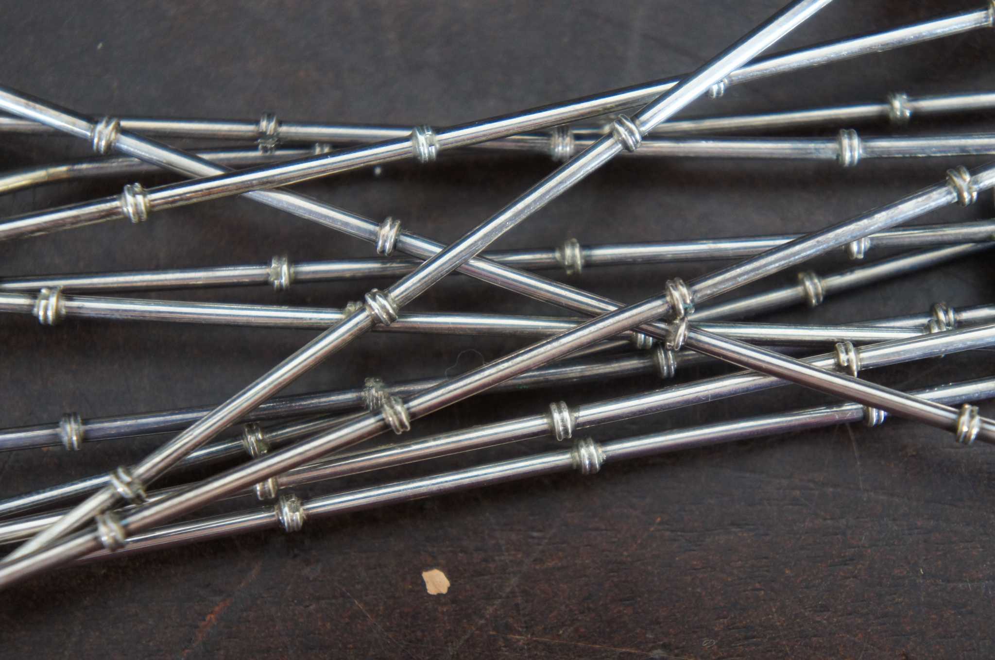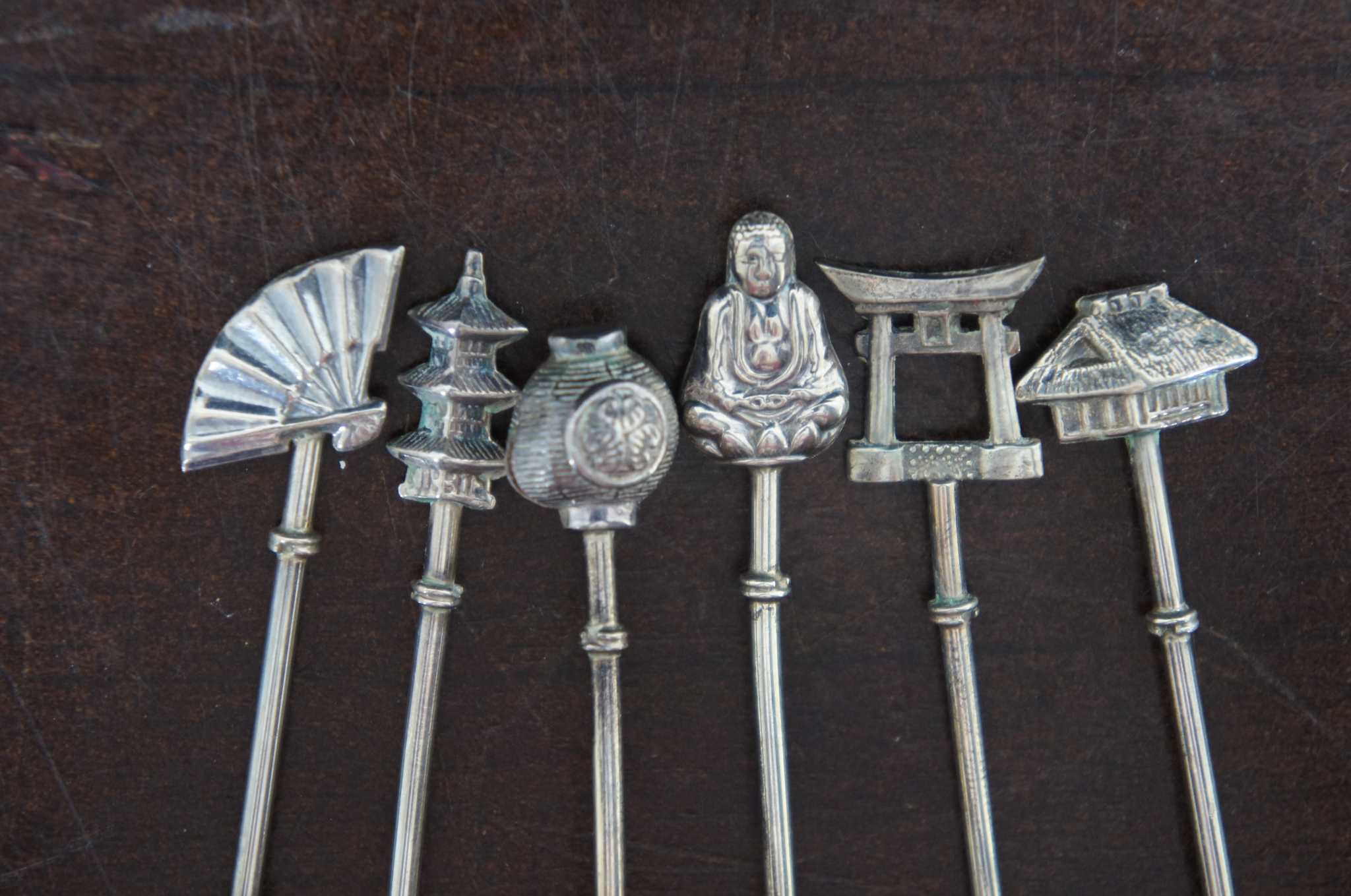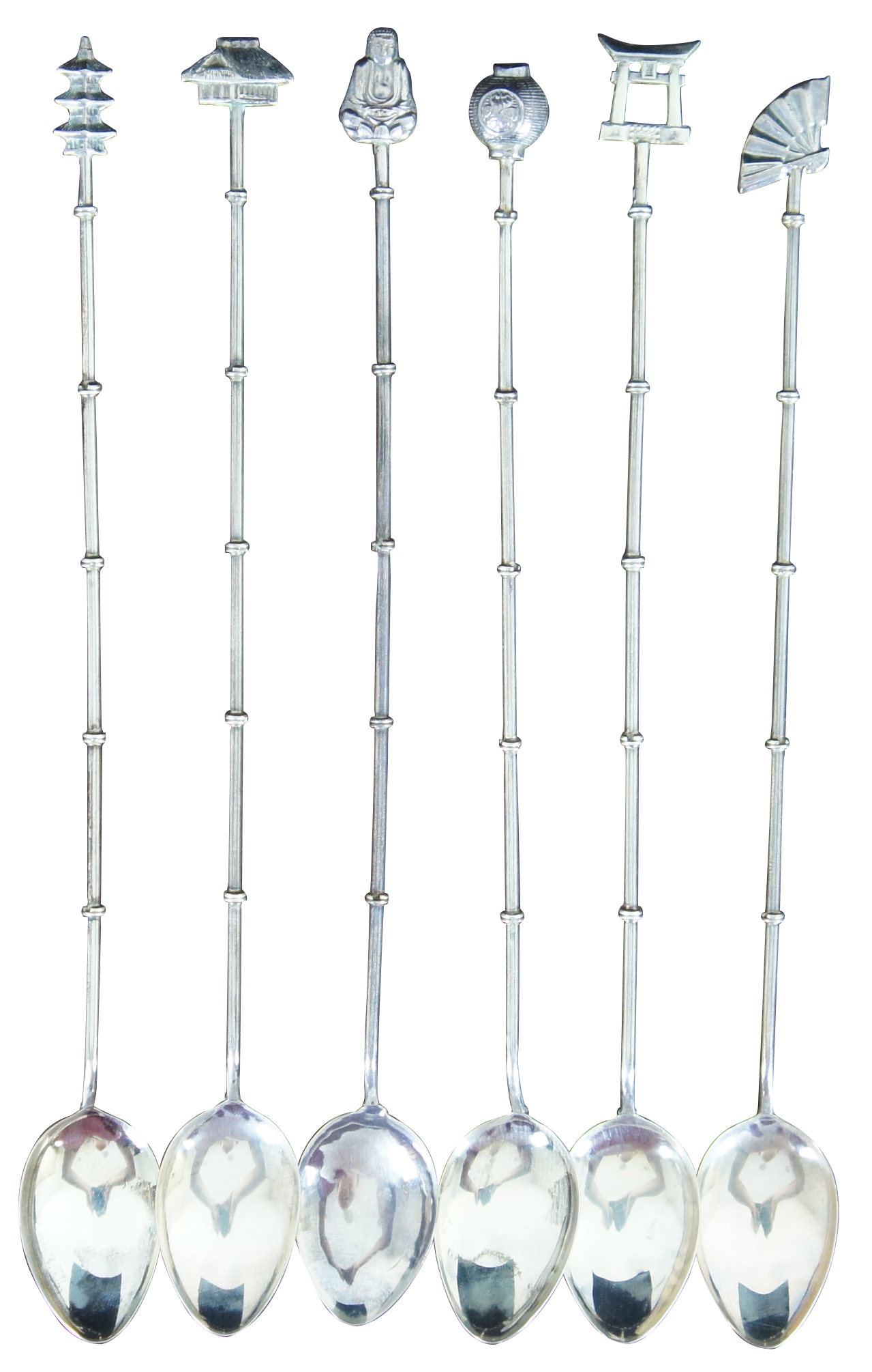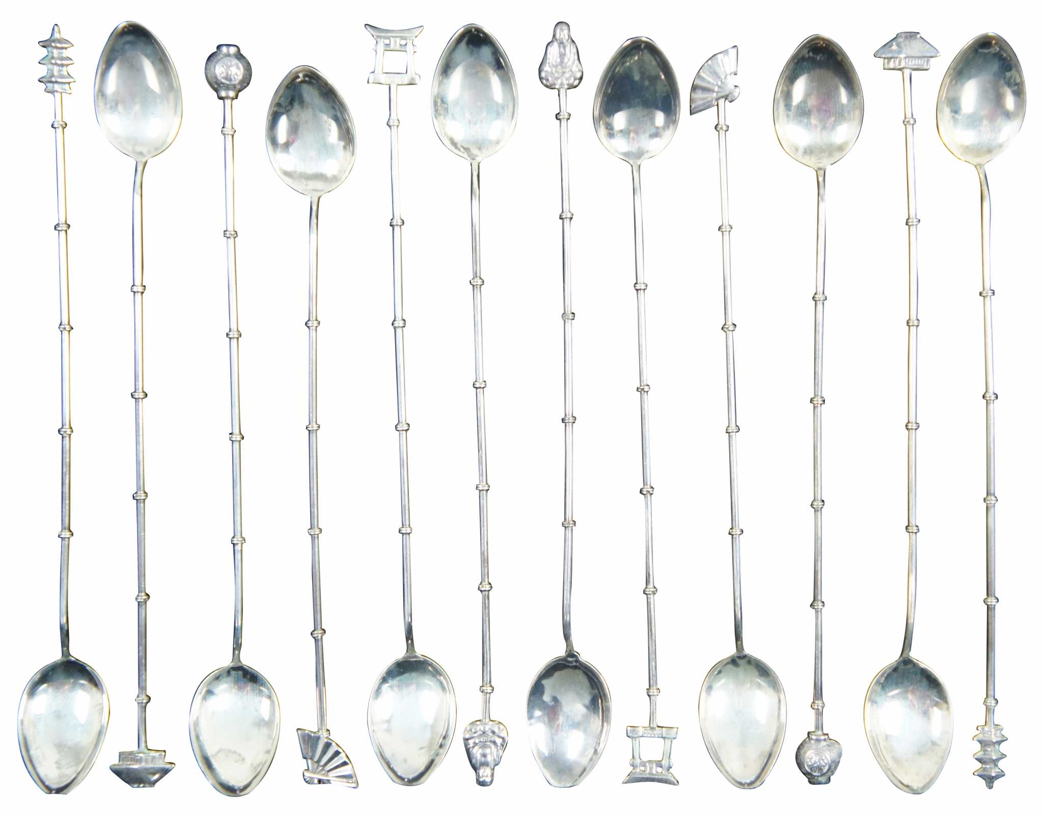 Sakai Silver Smiths Limited Sterling Silver Iced Tea/Mint Julep Cocktail Spoons. Each spoon features a long bamboo shaped shaft with a charm along the top. A nice compliment to any bar or kitchen. Includes Original Boxes.