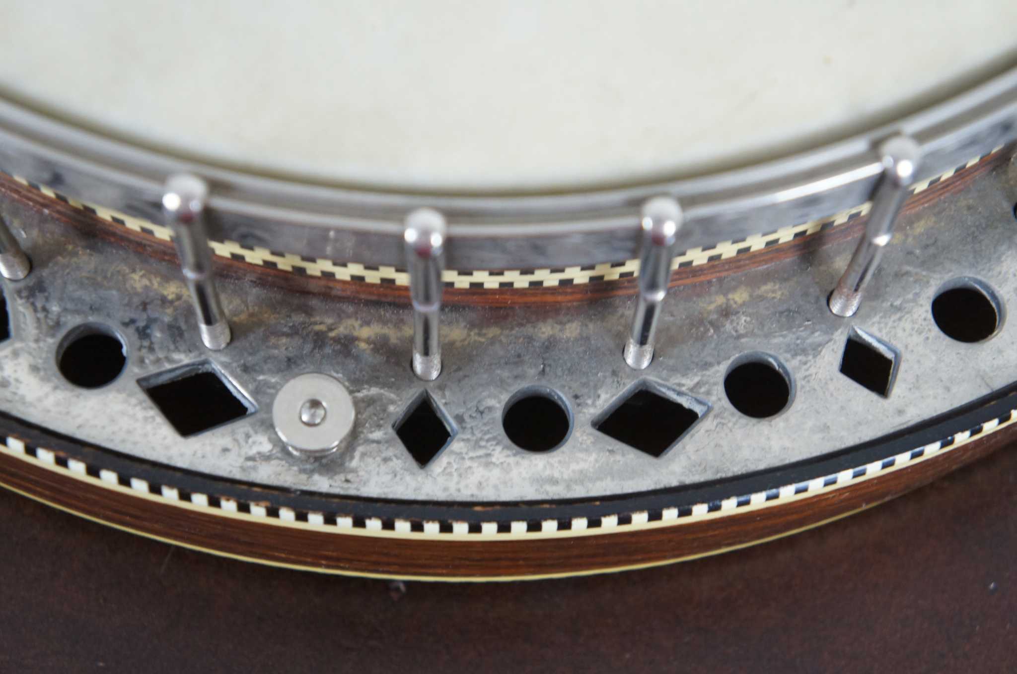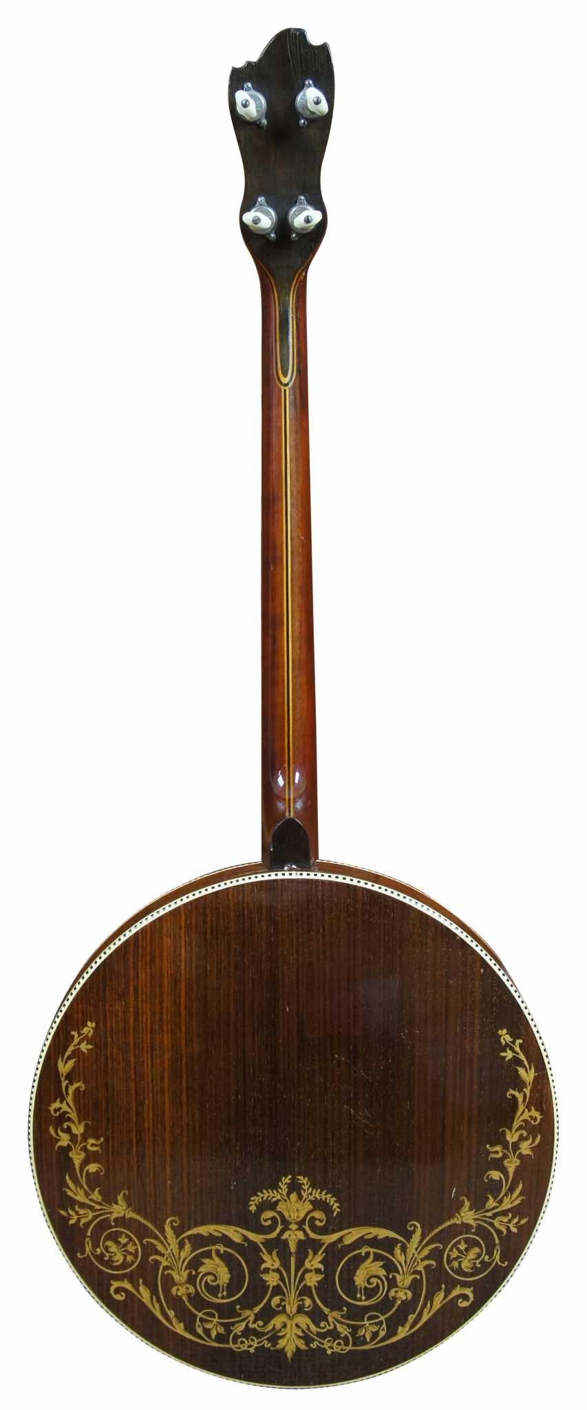 1930s Kay Kraft resonator tenor banjo & case. Made from maple with mother of pearl and marquetry inlay and ornate gold accents of baroque florals, trumpets and figural faces.