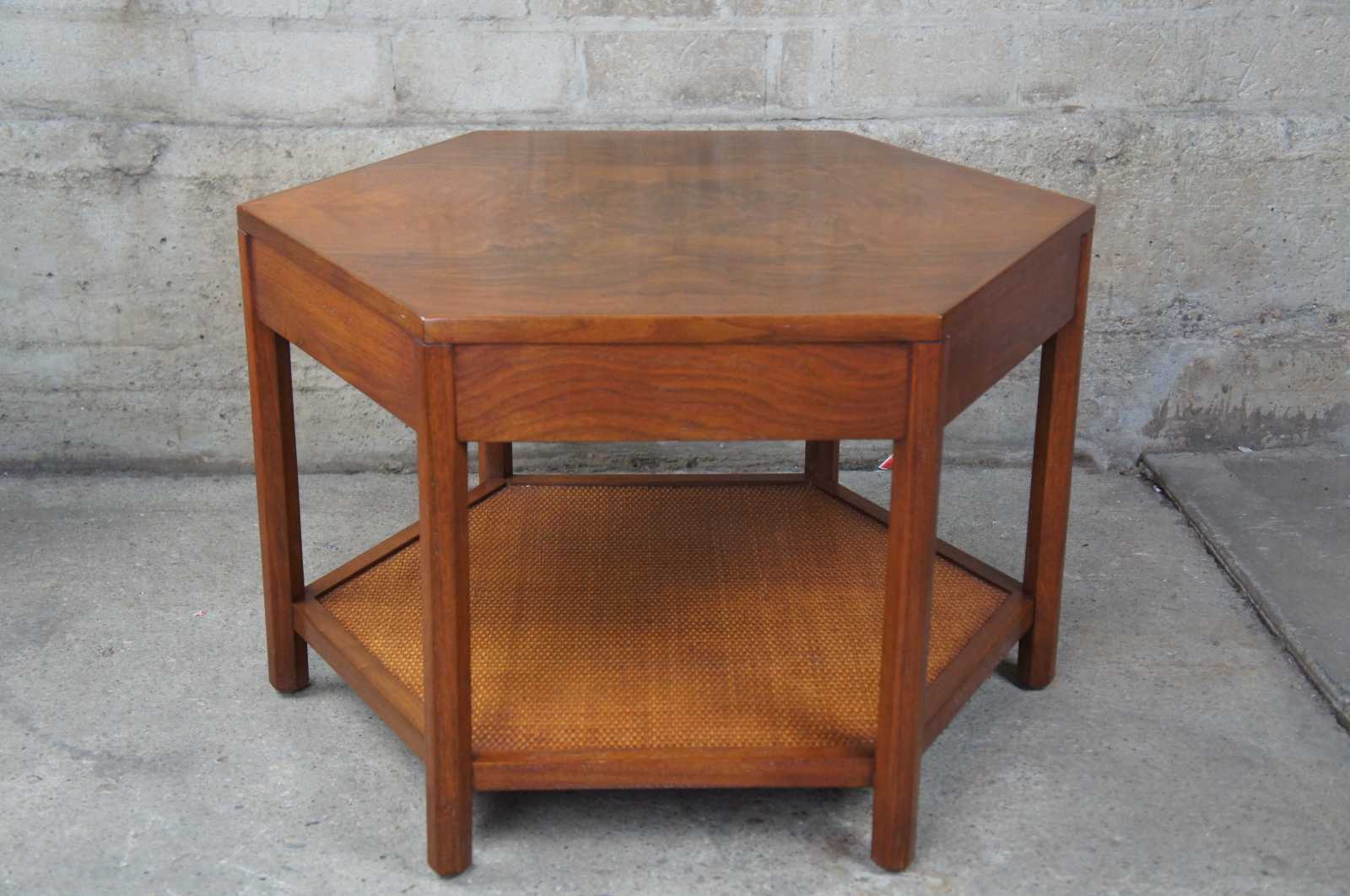 Mid 20th century hexagon side table with drawer. Made from walnut with a matchbook veneered top creating a unique burled pattern. Includes a drawer made from oak with brass pull and lower shelf made from rattan / wicker. Finished with a glass top with polished edge.