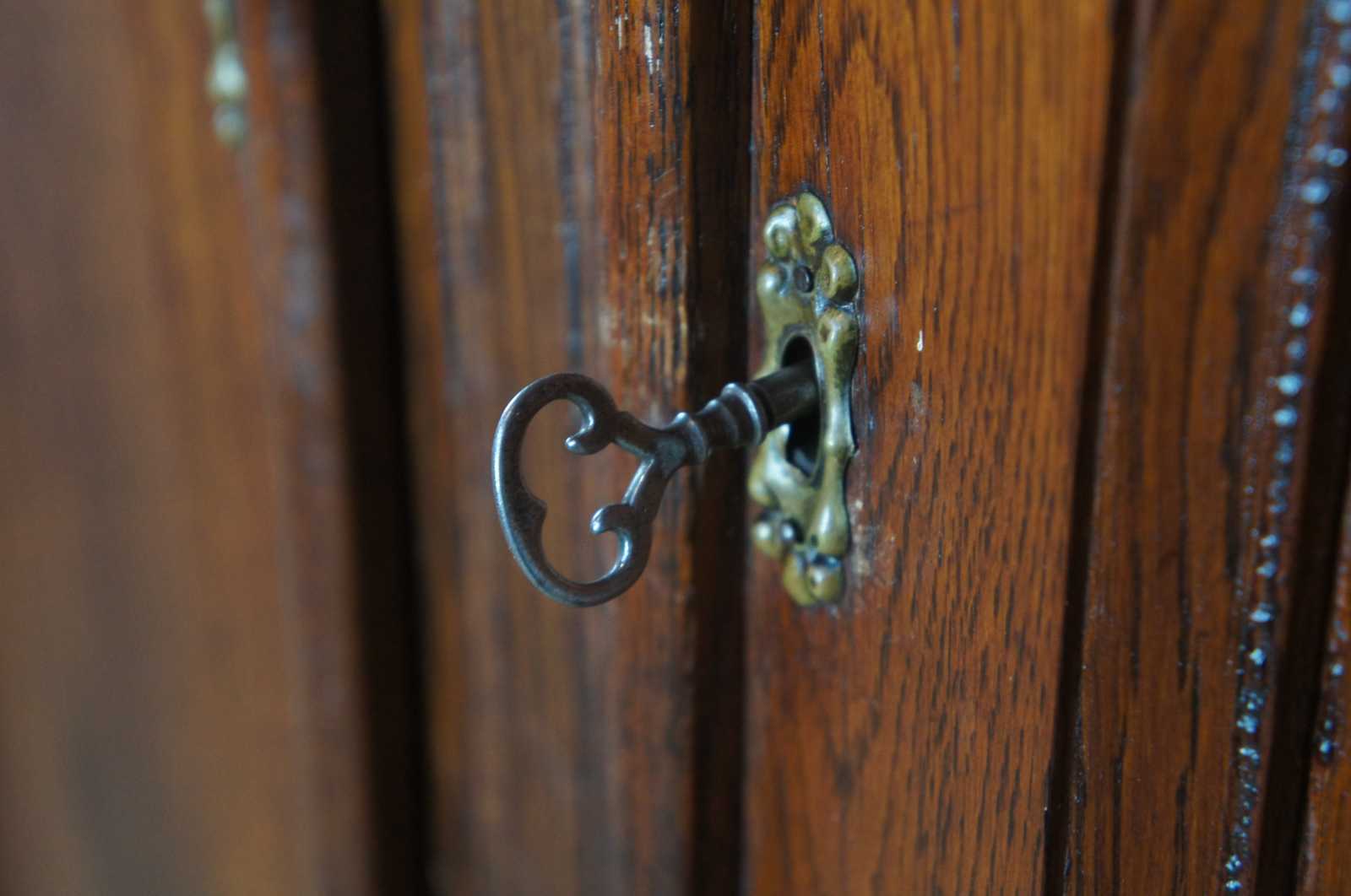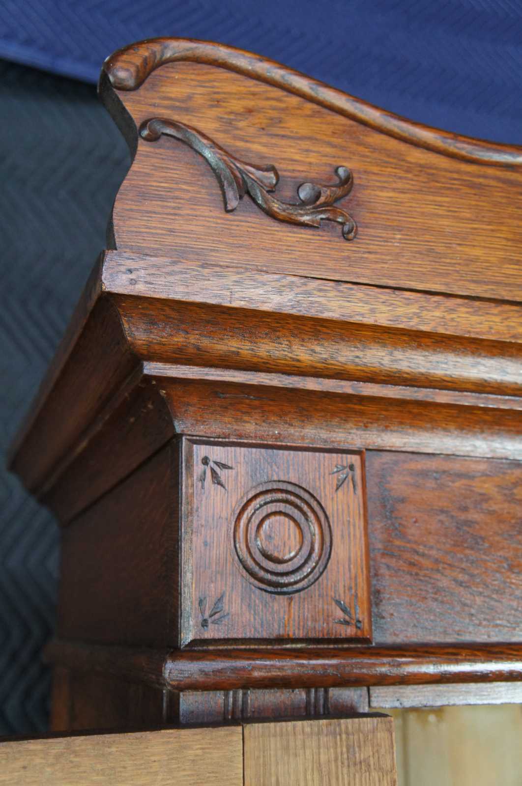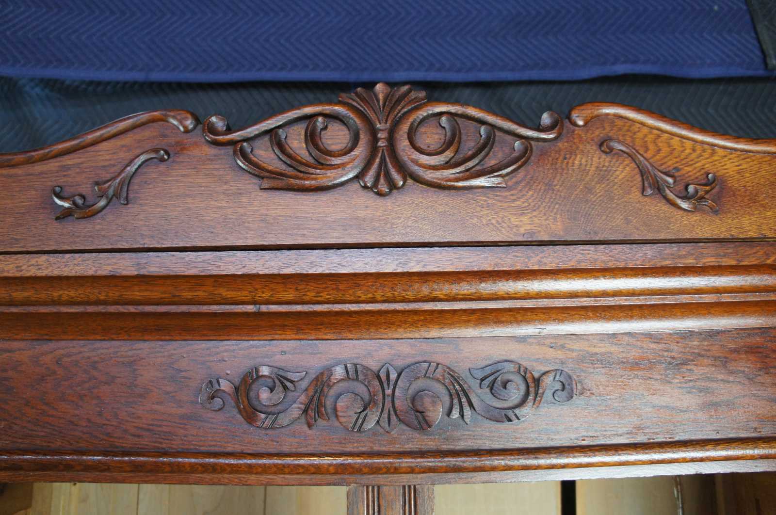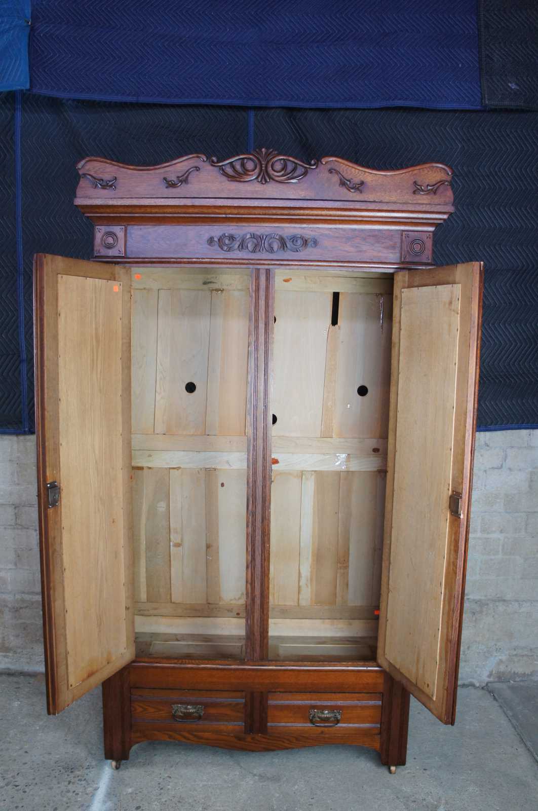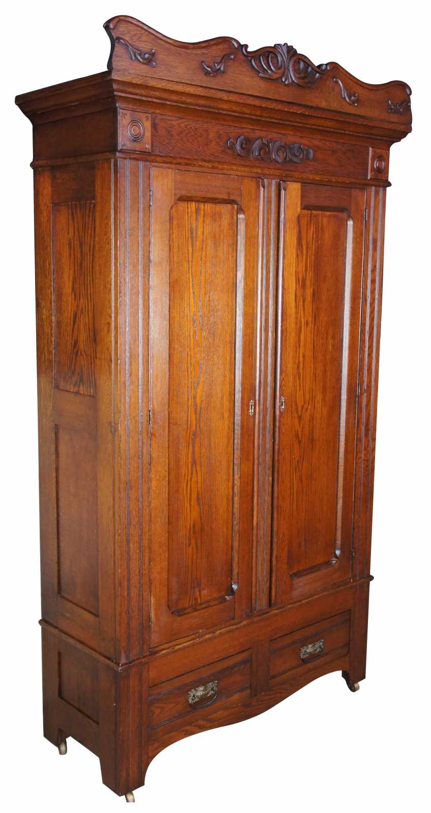 Antique Victorian oak knockdown armoire or wardrobe. Late 19th century, carved and scrolled accents and pronounced crown with rounded corner medallions. Features three shelves and two drawers, with functional lock and key.