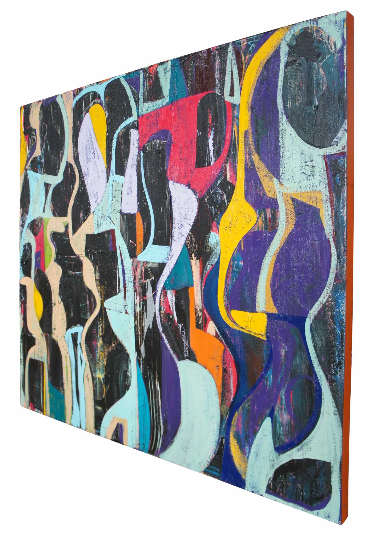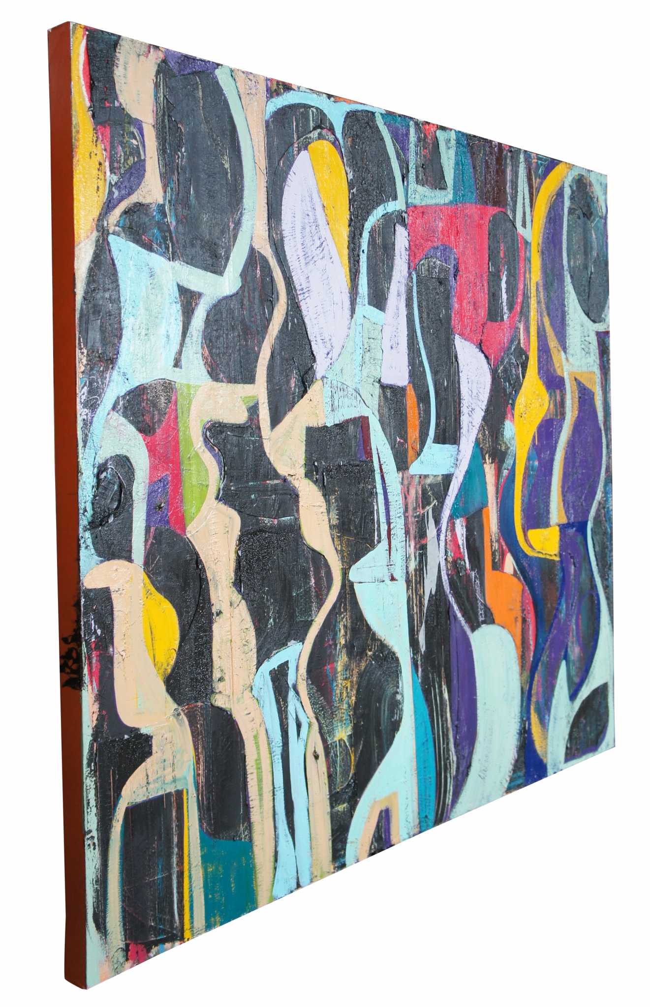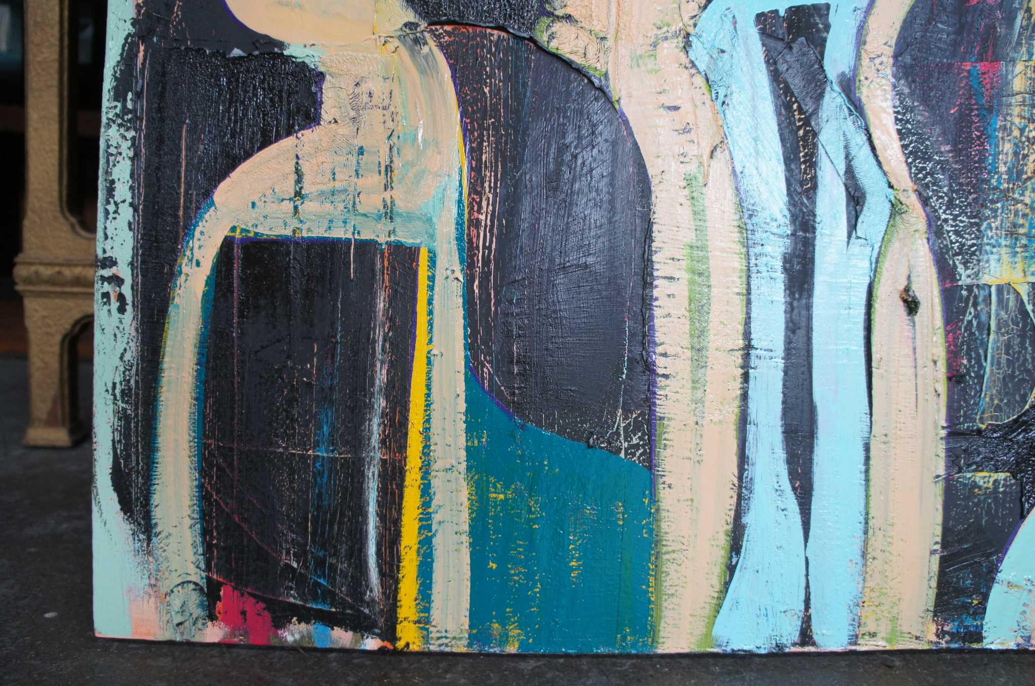 Large abstract modern expressionist painting by Jason Fascination. Painted in acrylic with a colorful mixture of vibrant shades. Canvas mounted to wood frame, painted on sides.