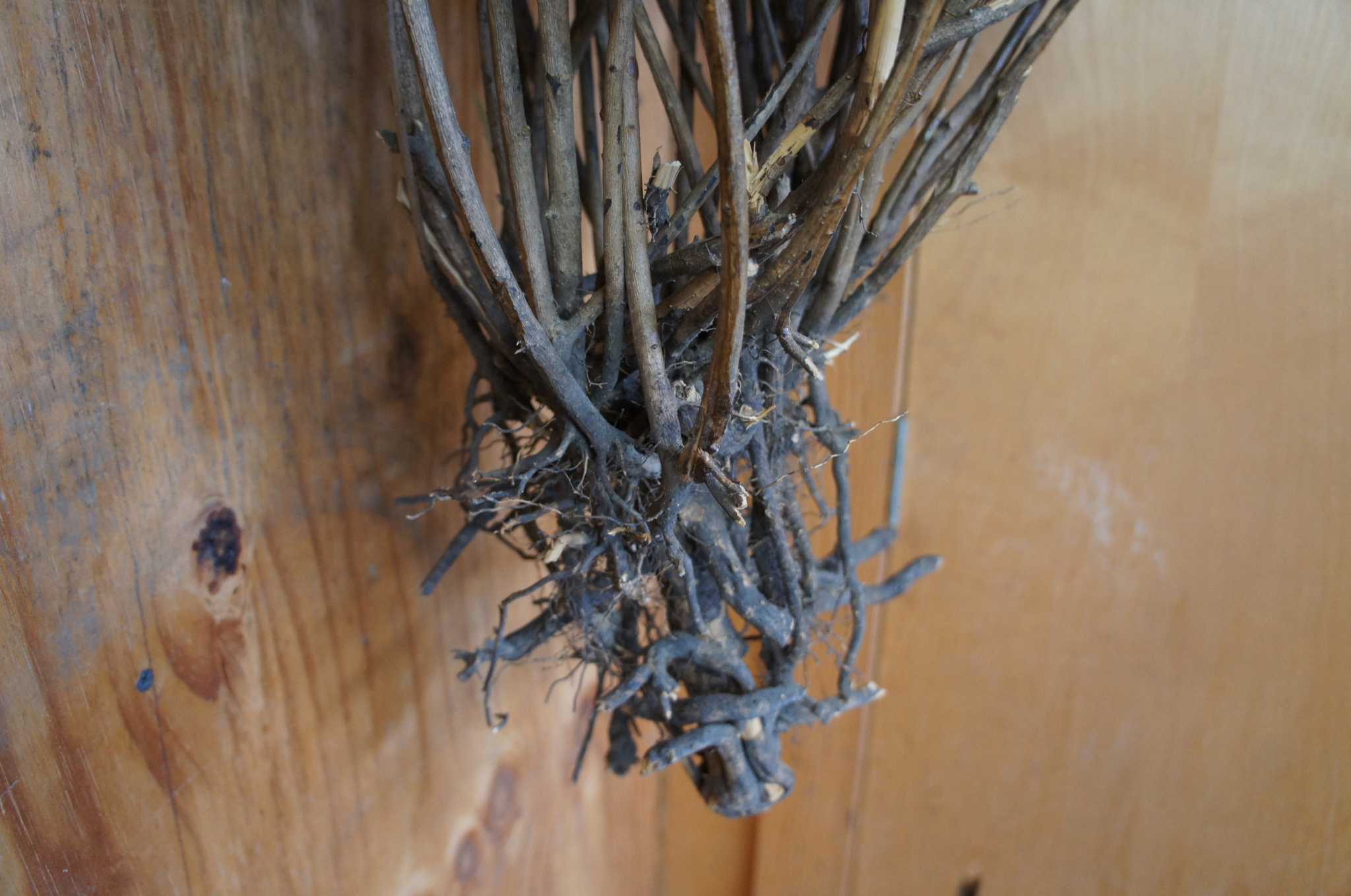 1993 contemporary art sculpture featuring a cube shape covered in sun dried tomatoes, with a twig or tree root system coming off the underside. Mounts to wall via cleat.