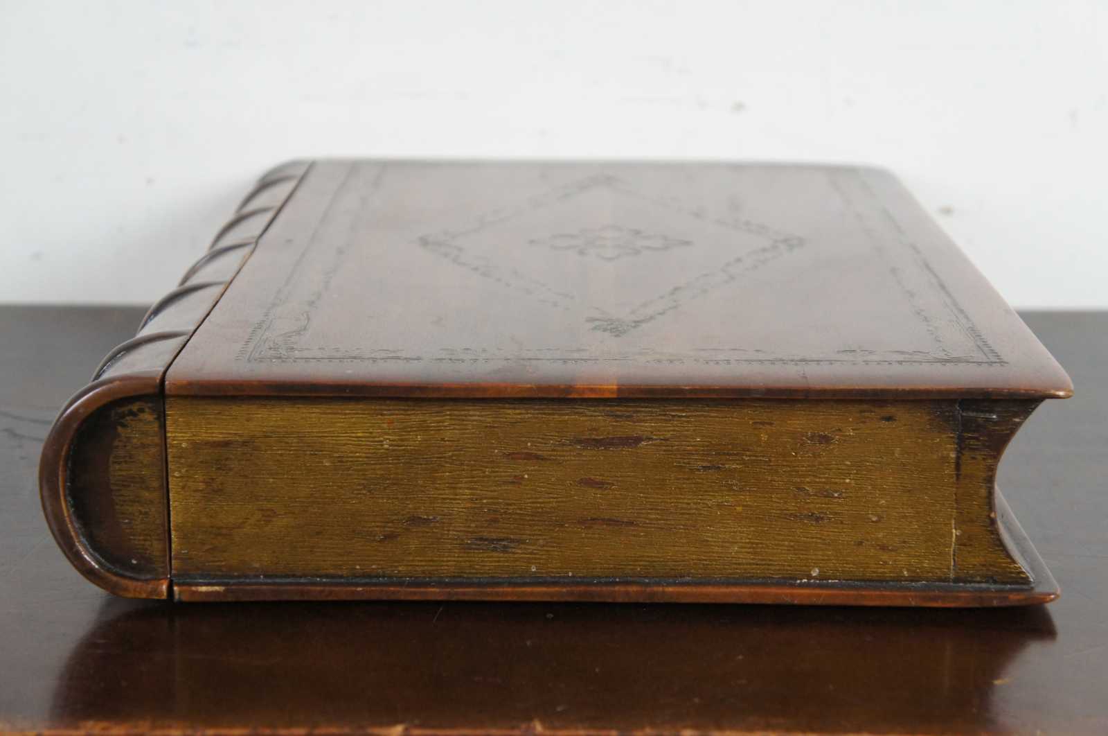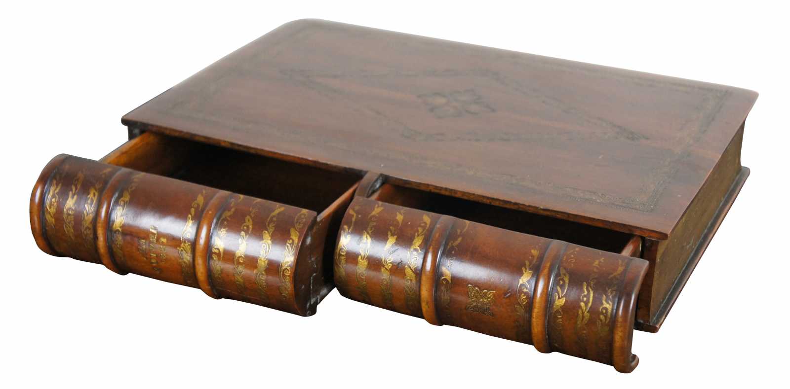 Mahogany book box by Maitland Smith. Features tooled ornate gold carved fleur de lis and scroll details. Often called faux or fake books, this book has no pages, bu two large spaces / compartments to hid trinkets, money, jewelery, guns or anything you want.