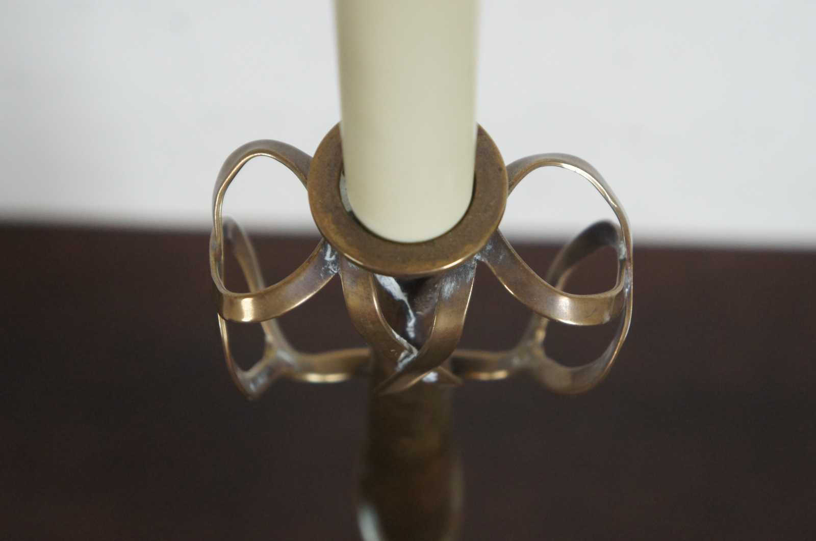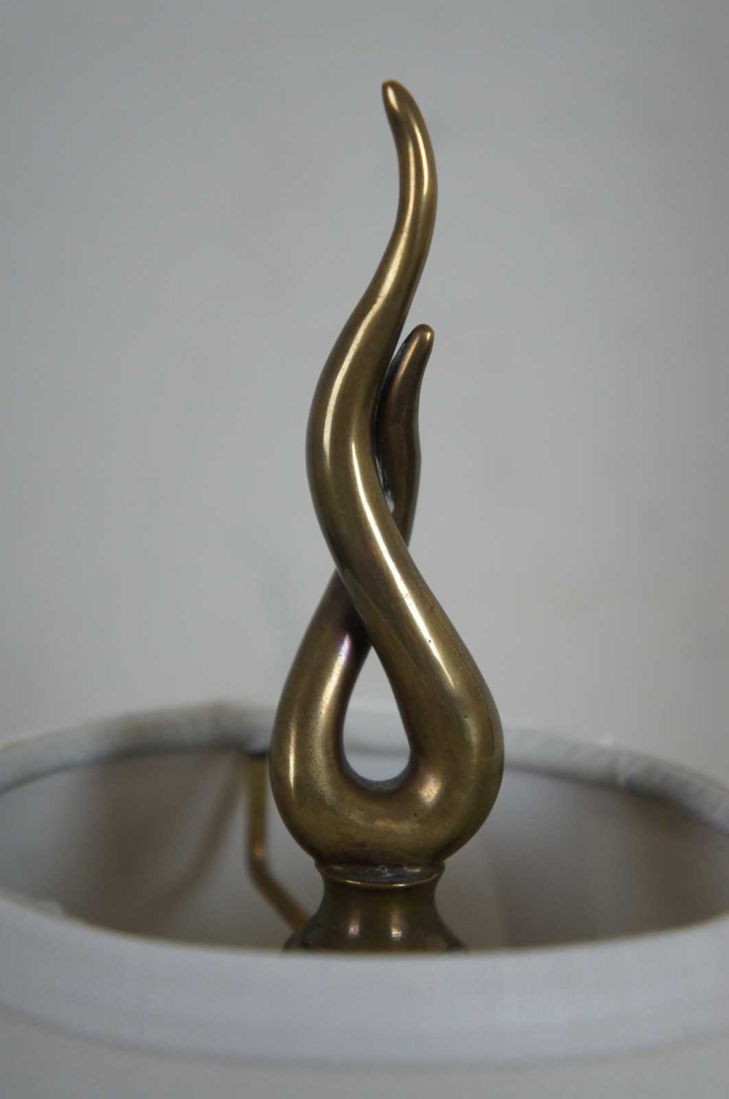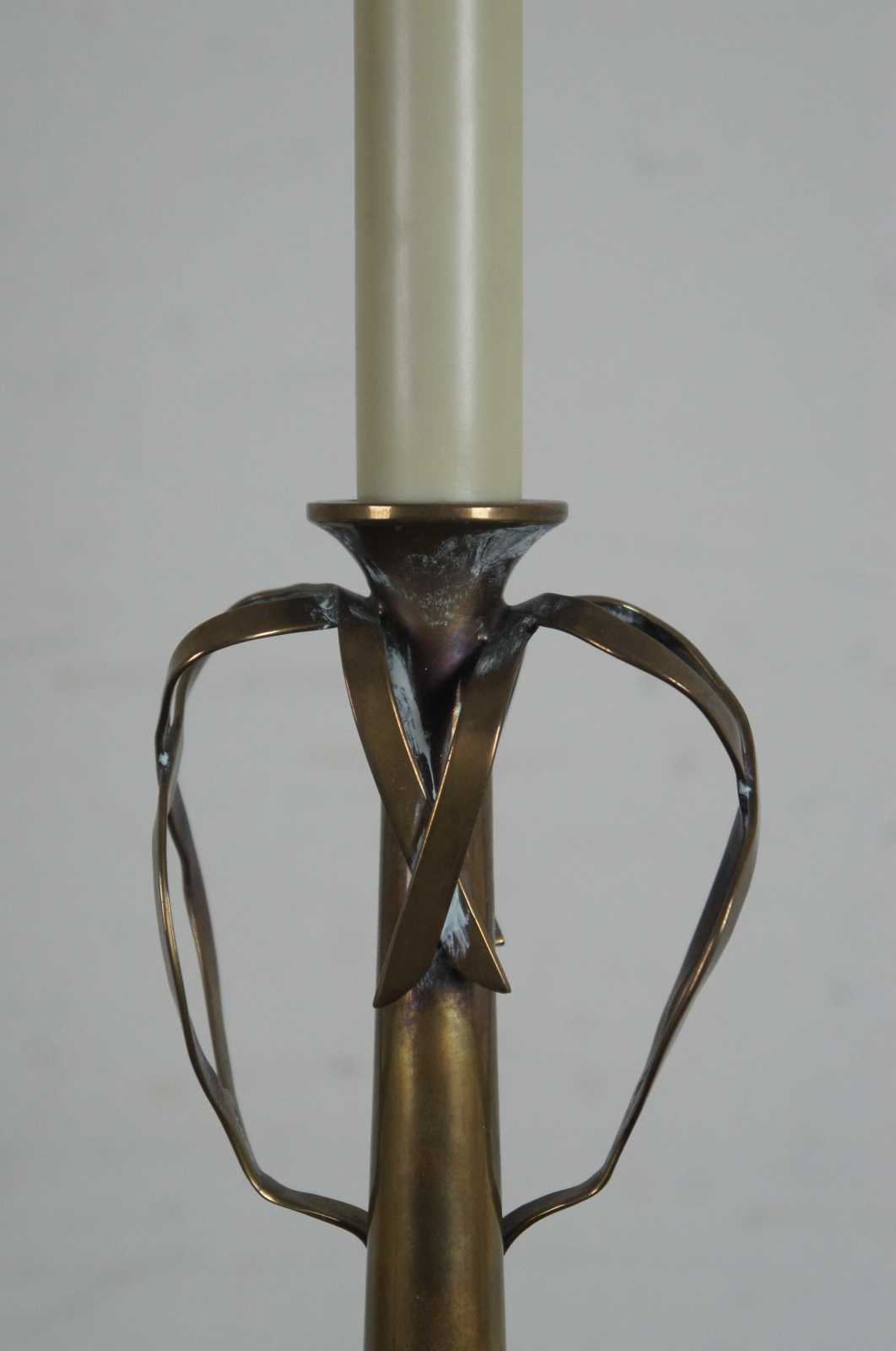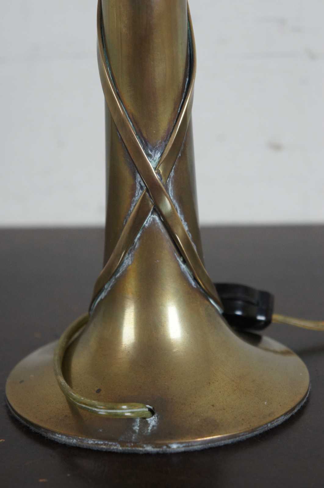 1996 Chapman brass candlestick trumpet lamp. Features neoclassical styling with a trumpet base, oval shade and torchiere finial.