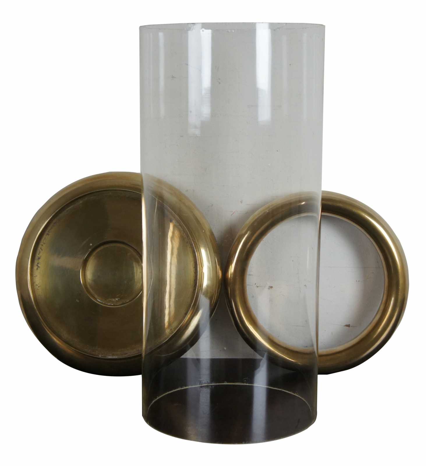 Chapman "Bun" hurricane lantern or candle holder. Features heavy brass base and top with hand blown 10" glass hurricane between. Made in 1980, retired.