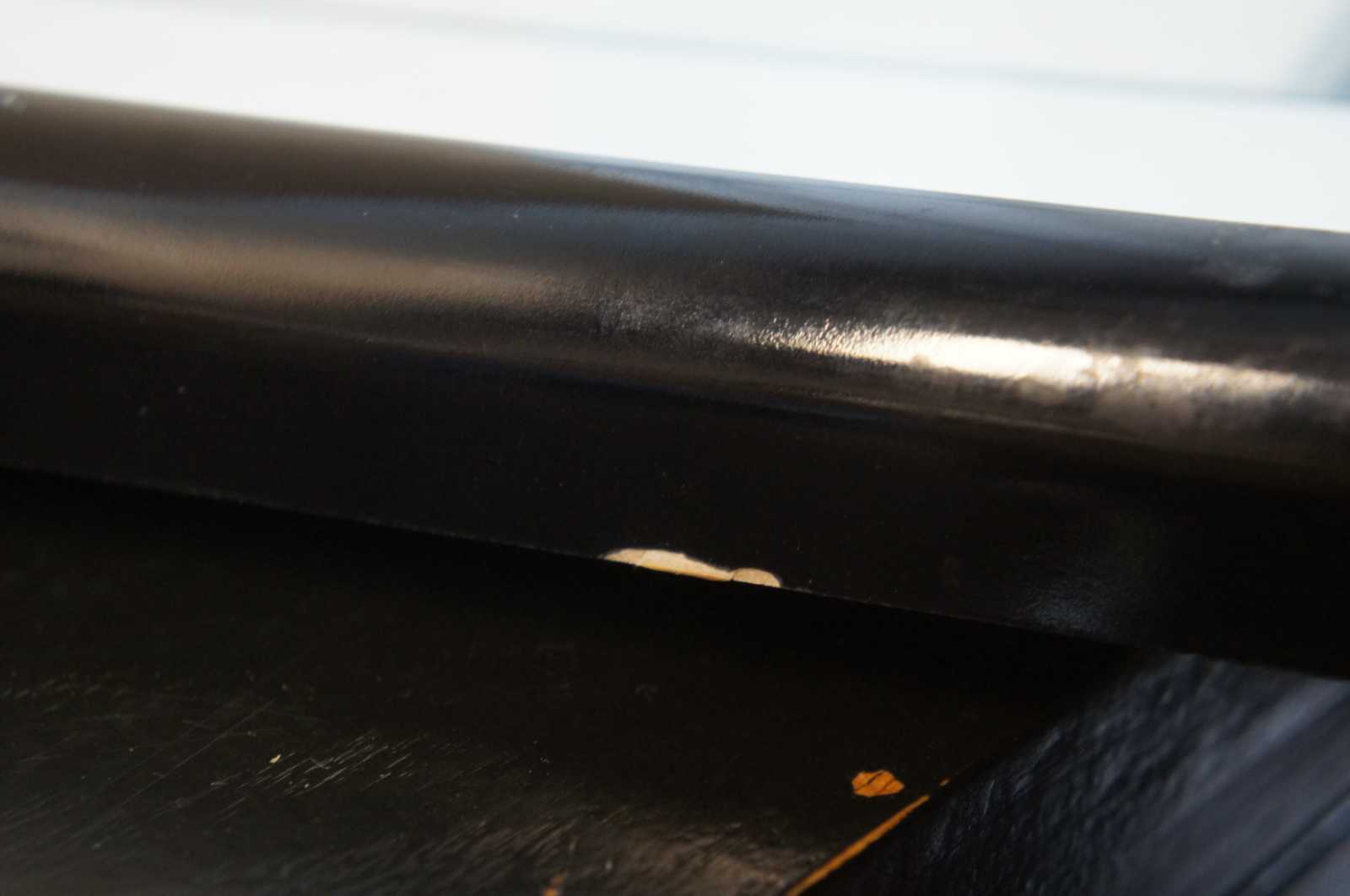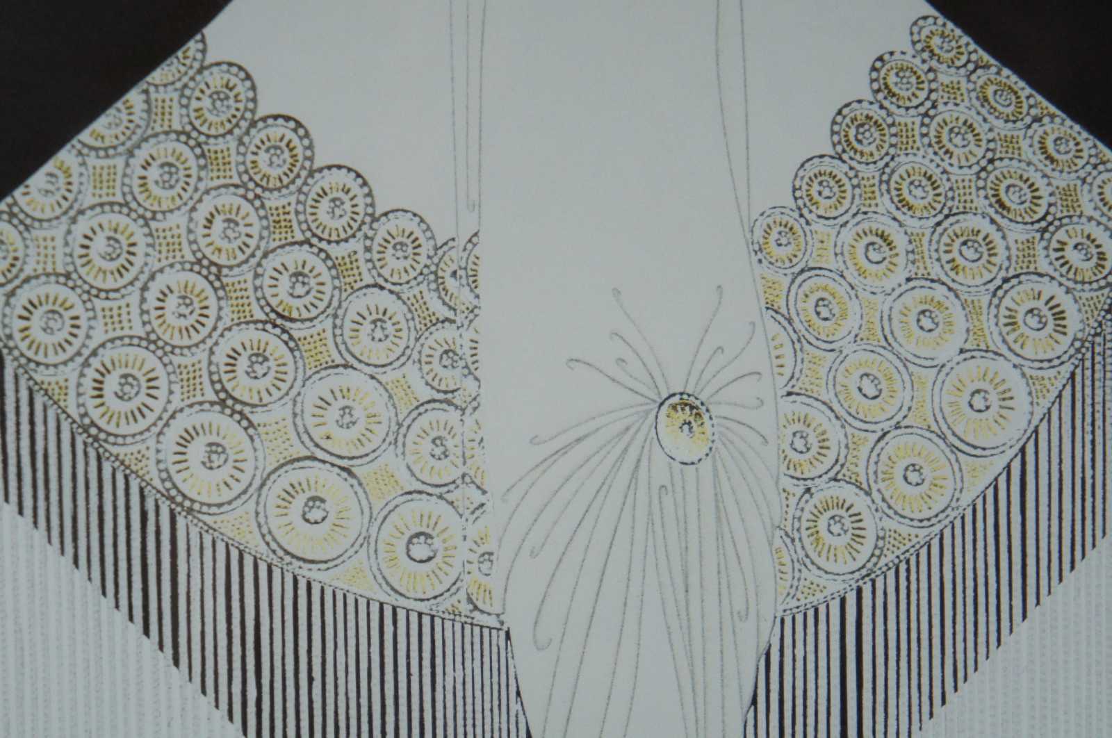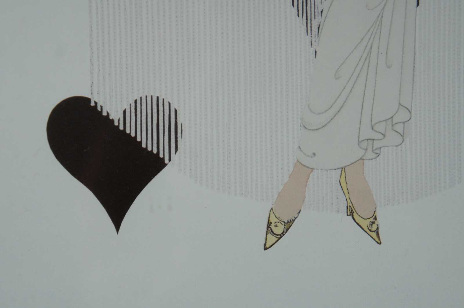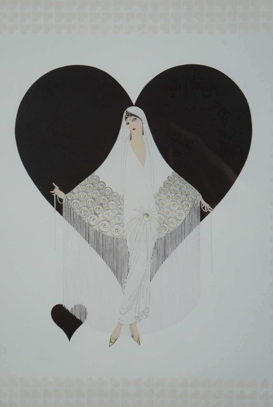 Erte art print, titled "Fringe Gown", featuring a women in art deco garb against the backdrop of a black heart and repeating heart motif boarder.