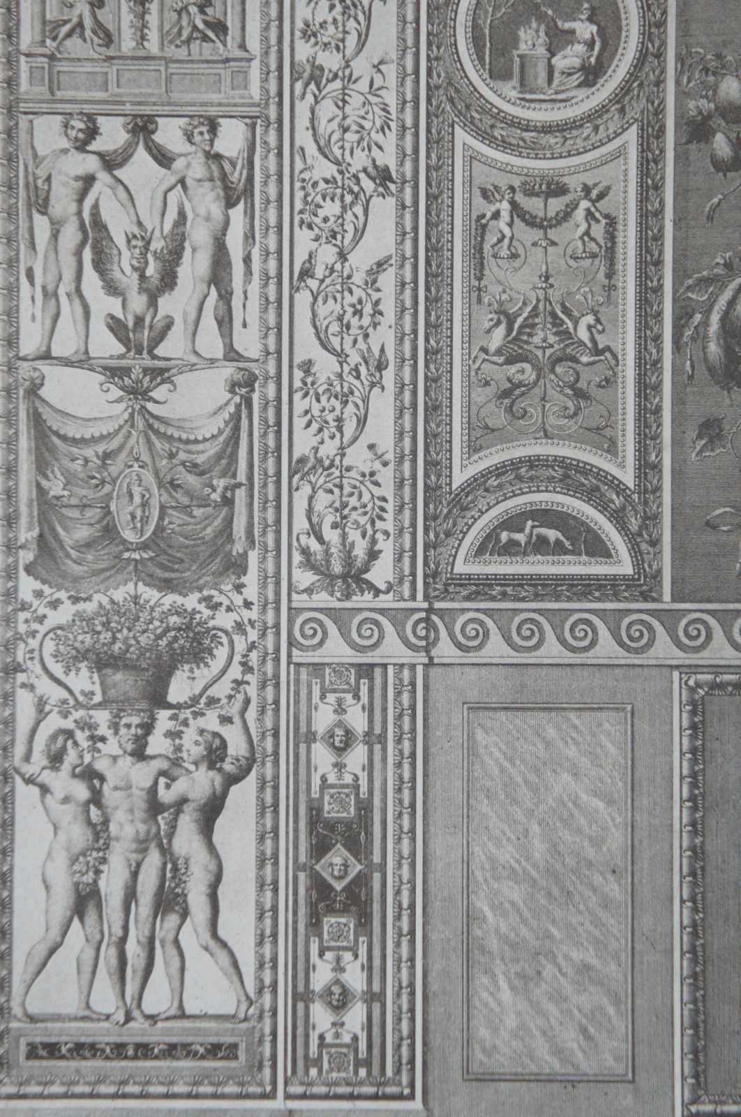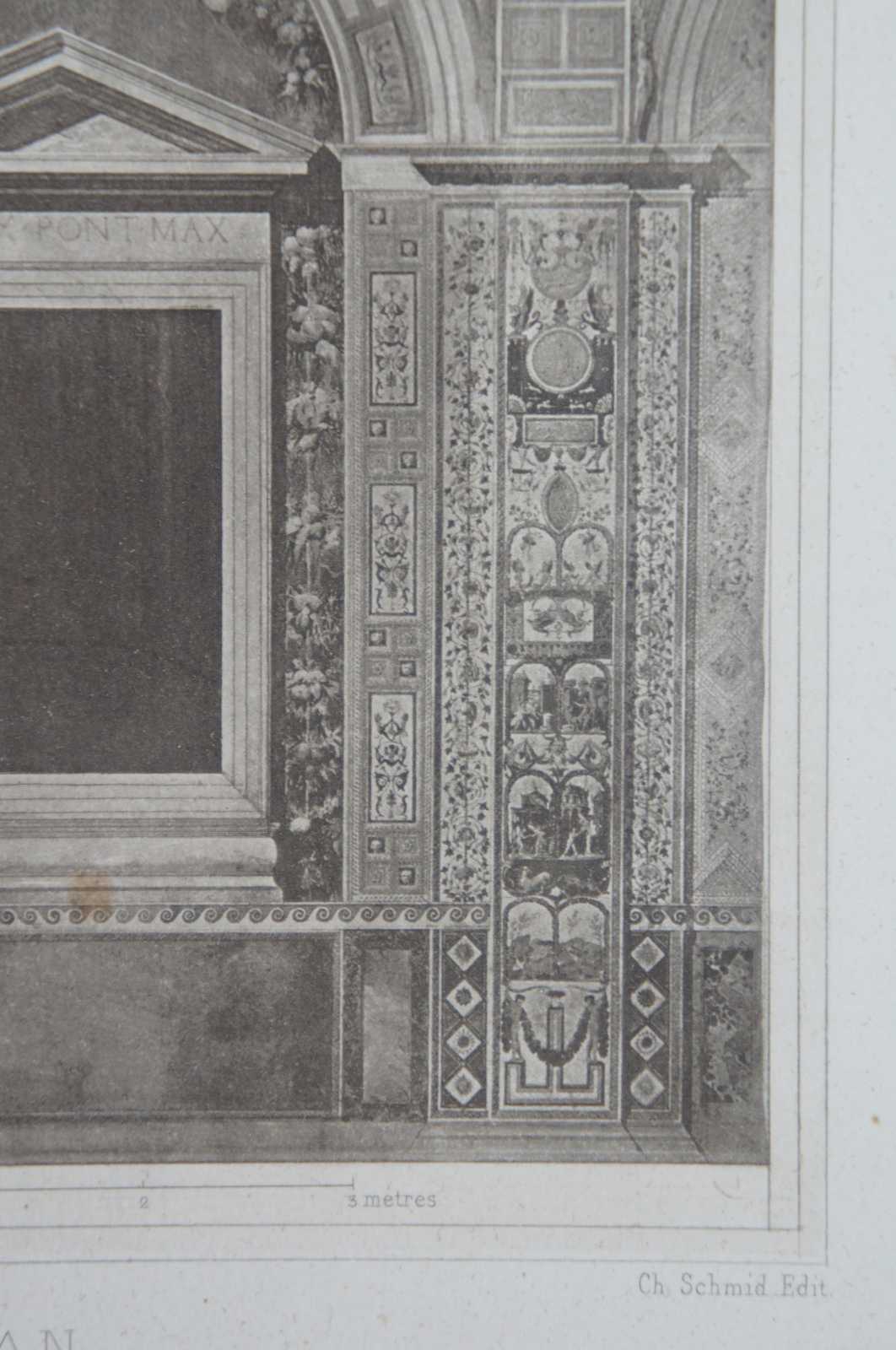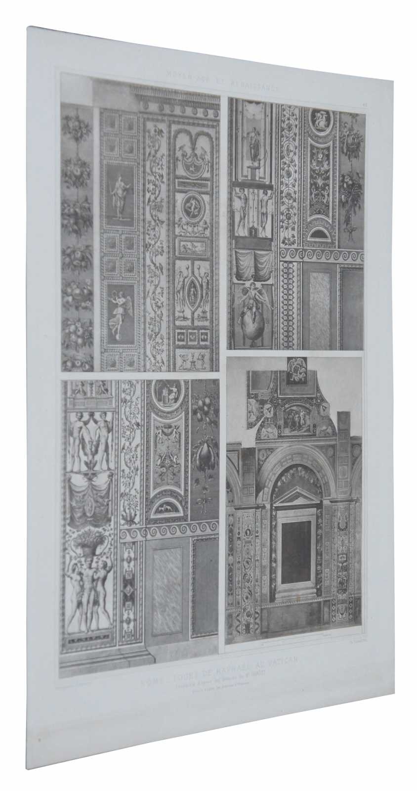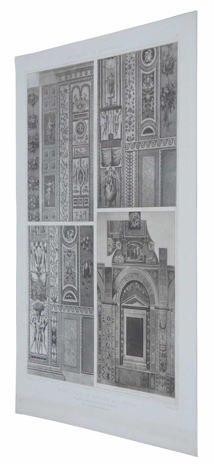 A set according to the drawings of Guadet. Detailed after the engravings of Ottaviani. Reads "Rome Loges de Raphael au Vatican Engraving. Ensemble d'apres les dessins de mt Guadet. Details d'apres les gravures d'ottaviani. Heliogravure Lemercier. Moyen Age Et Renaissance". Features floral motifs, angels, unicorns / narwol figures, nudes, cherubs, other animals, goddesses / figures, architectural designs.