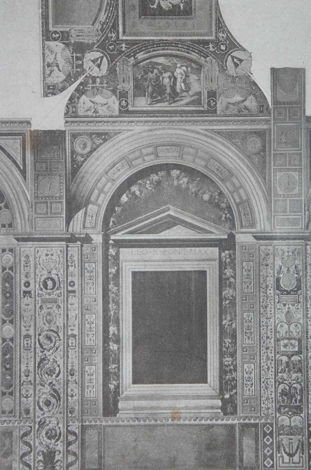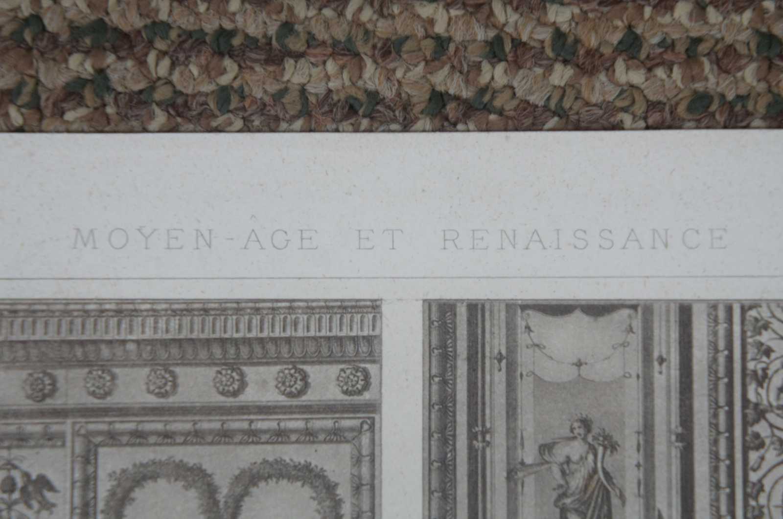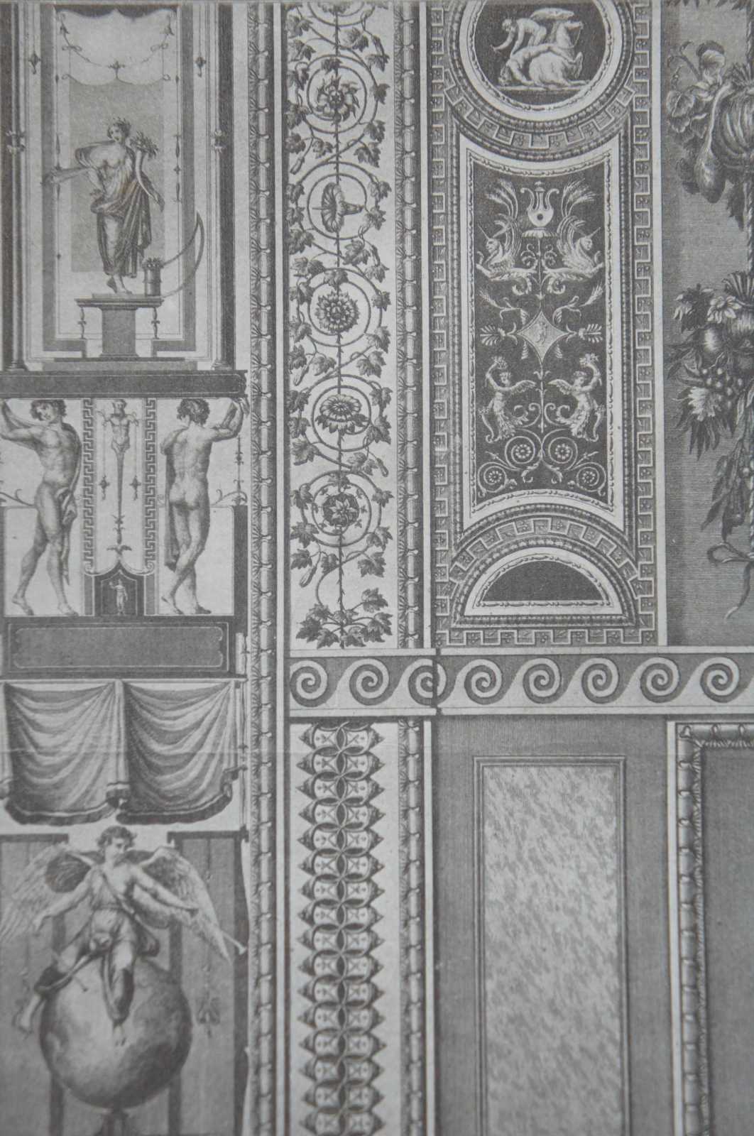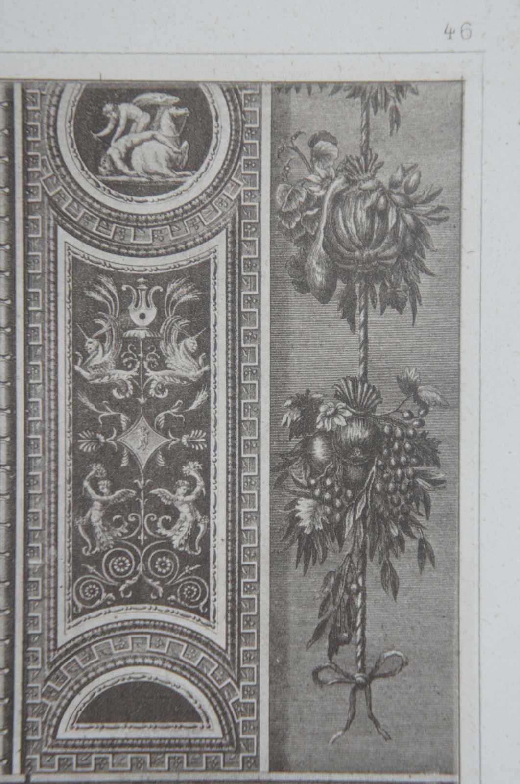 A set according to the drawings of Guadet. Detailed after the engravings of Ottaviani. Reads "Rome Loges de Raphael au Vatican Engraving. Ensemble d'apres les dessins de mt Guadet. Details d'apres les gravures d'ottaviani. Heliogravure Lemercier. Moyen Age Et Renaissance". Features floral motifs, angels, unicorns / narwol figures, nudes, cherubs, other animals, goddesses / figures, architectural designs.