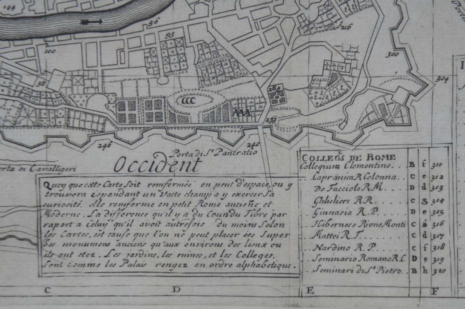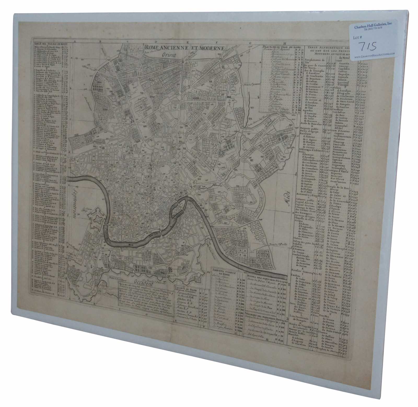 Antique print, titled: 'Rome Ancienne et Moderne.' - This handsome plan of Rome shows the streets, parks, major buildings and the fortifications and ramparts in the southern part of the city below the river. Numerous tables keyed to the map name hundreds of palaces, colleges, gardens, ancient ruins and monuments and other important buildings. Eighteen formal gardens are listed. Engraving on hand laid paper. Description: Atlas Historique.' (Historic Atlas.), Published by Zacharie Chatelain, Amsterdam. The atlas was published in seven volumes between 1705 and 1720, with a second edition appearing in 1732. The maps were accompanied by information pertaining to cosmography, geography, history, chronology, genealogy, topography, heraldry, and costumes of the world. The maps in the Atlas Historique were mainly based on those of the French cartographer, Guillaume De L'Isle, but were presented by the Chatelains in an encyclopaedic form.