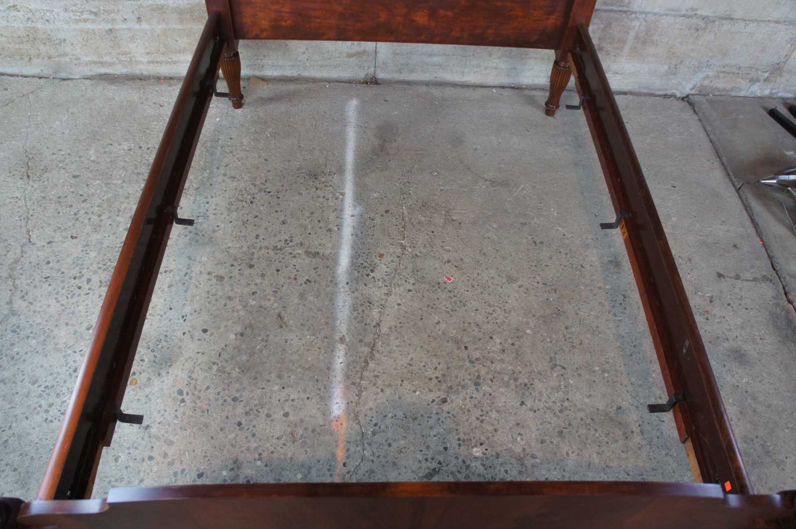 Exceptional Georgian era mahogany poster bed. Features flamed mahogany panels, an open pediment with trophy form, and four tapered and fluted posters. Fits a full size matress.