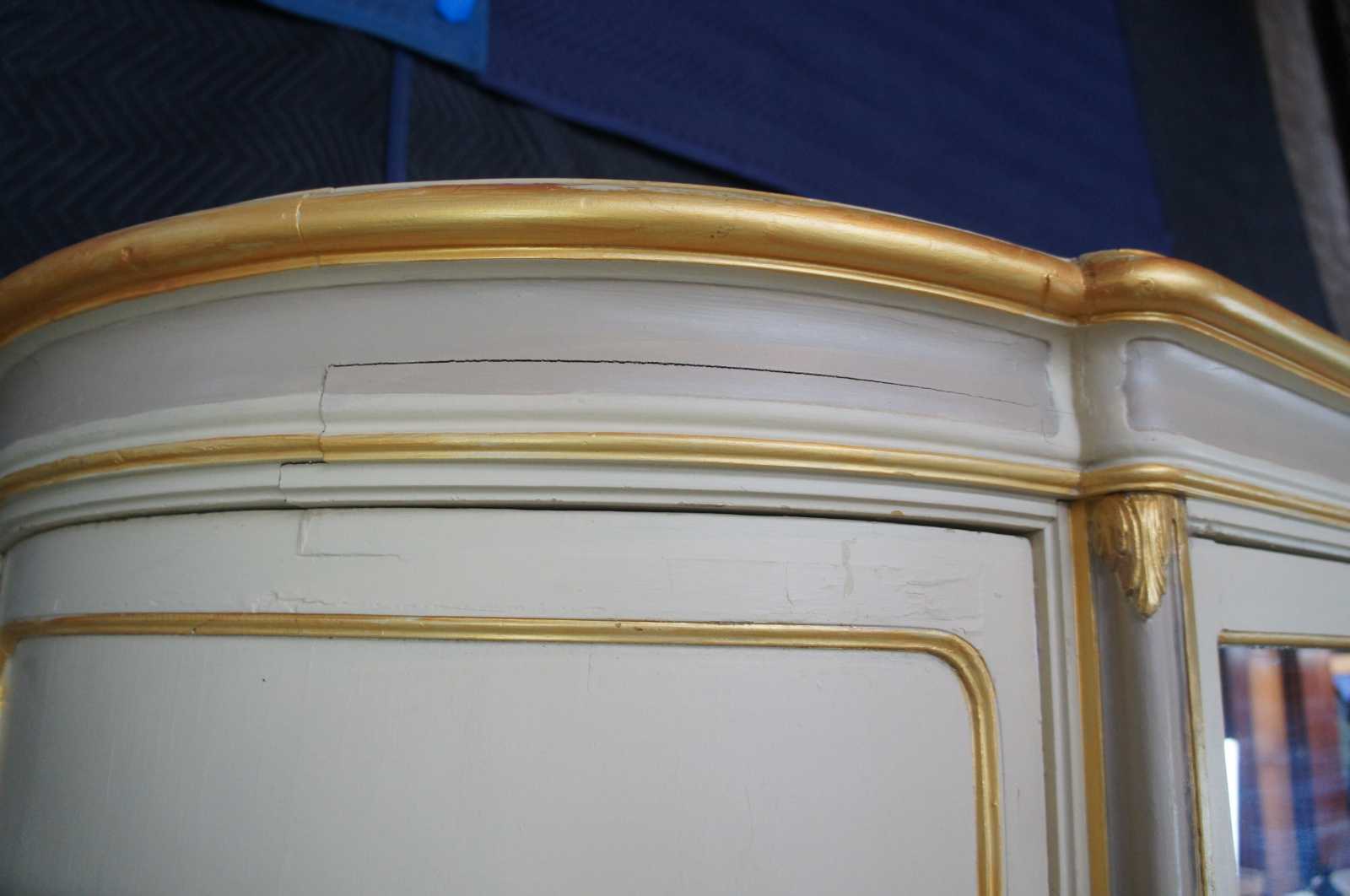 Antique monumental hand painted French Provincial knockdown wardrobe. A one of a kind cabinet that could be used to replace a closet. Features a demilune shape with pierced outer doors and fleur de lis design. The central cabinet door is handpainted with two women picking grapes. flanked by two mirrors. Opens to a vast array of shelving, includes scalloped trim and cabriole feet. Finish of the cabinet is white with gray panels and gold trim. Circa 1930s.