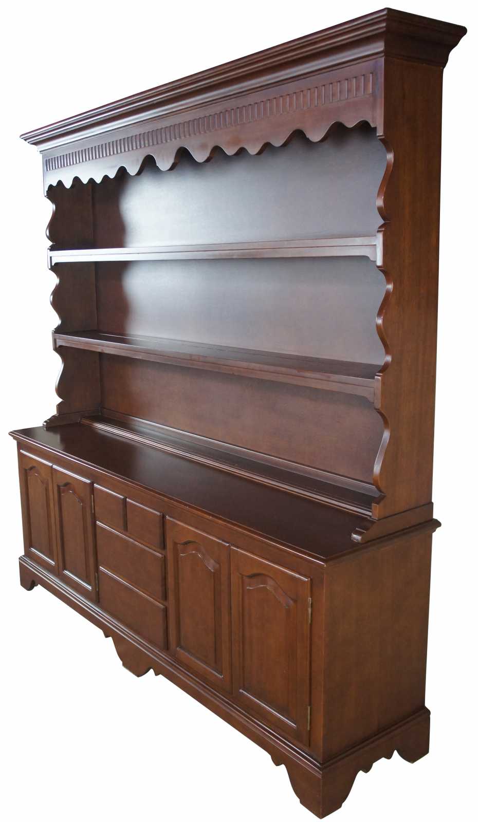 Early American style mahogany sideboard with hutch. Features a serpentine design with three shelves including plate grooves. Opens to three drawers and two outter cabinets for china storage. Hand made circa late 20th century.